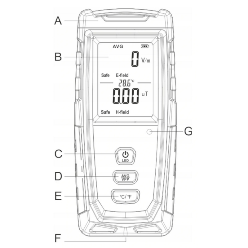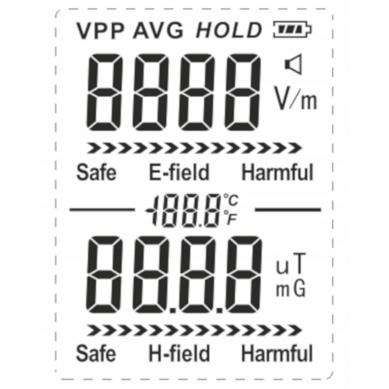 - Діапазон: 1 В/м-1999 В/м (електричне поле) / 0,01 мкТл-99,99 мкТл (магнітне поле),