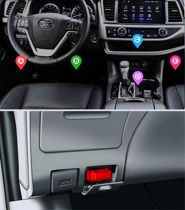 Гніздо OBD2 часто розташоване під кермом або в центральній частині. На малюнку нижче показано місця, де зазвичай можна знайти такий роз’єм у сумісних автомобілях.