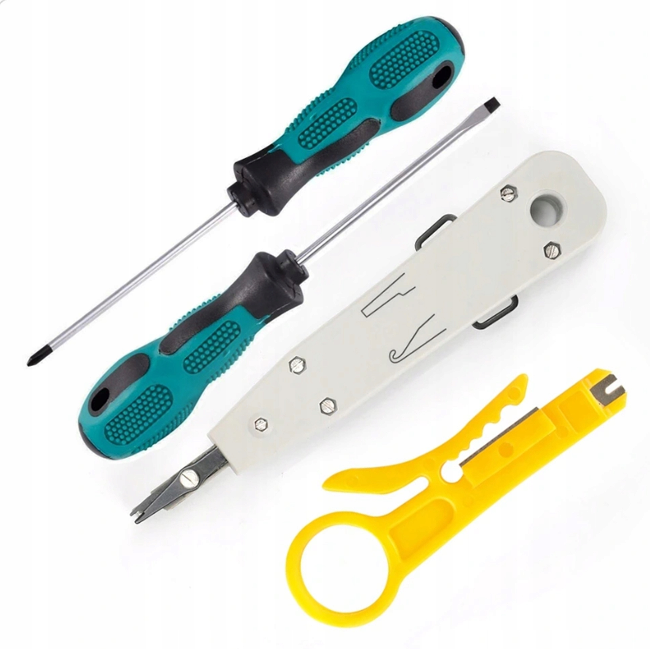 НАБІР - набір включає тестер кабелю, обтискач, штовхач, штекери RJ 45, плоску та хрестову викрутки та знімач ізоляції.