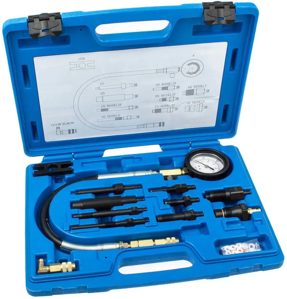 - За допомогою цього компрессора ви можете швидко перевірити, чи дизельний двигун втрачає компресію. Це допоможе виявити такі проблеми, як зношені поршневі кільця, згорілі клапани, зношені напрямні клапанів або тріснута прокладка головки. Цей комплексний набір підходить для дизельних двигунів легкових, вантажних автомобілів і тракторів.
