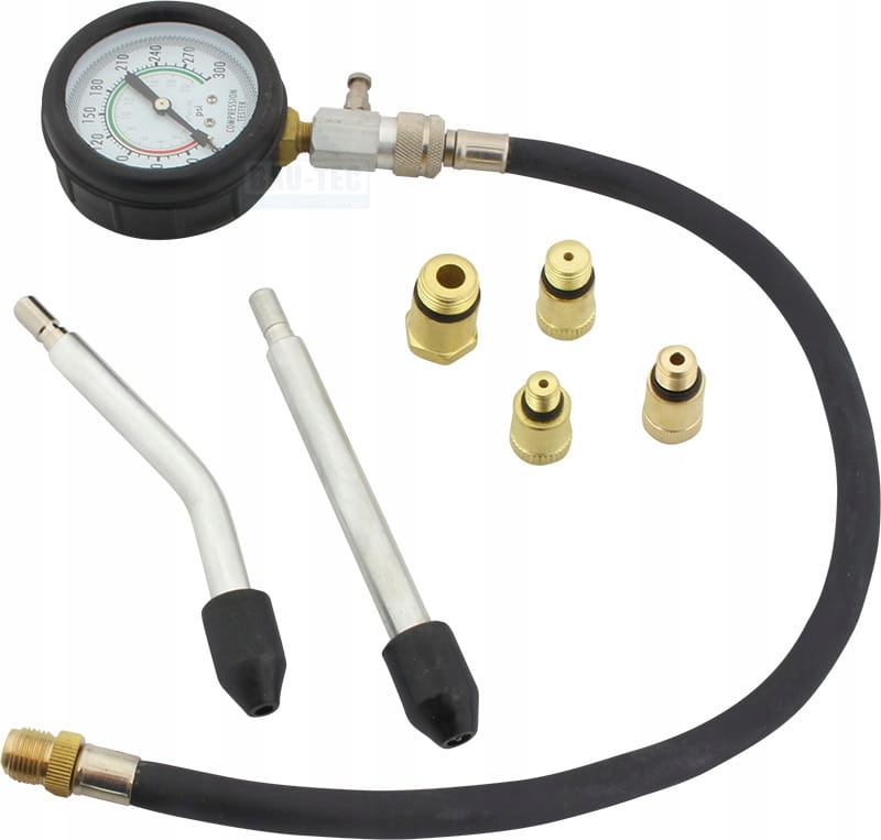 Тестер для перевірки тиску компресії в циліндрах бензинового двигуназ аксесуарами, що розширюють його можливості.