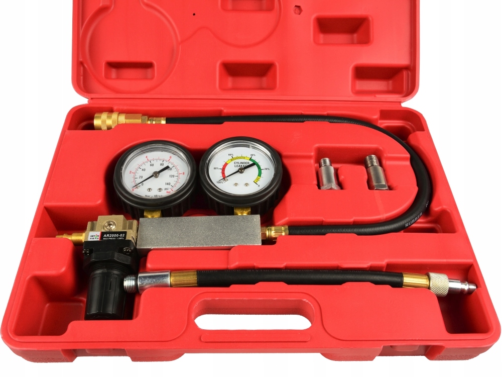 Професійний тестер від відомого бренду GEKO призначений для вимірювання герметичності циліндрів двигуна. Прилад оснащений двома манометрами з чіткою шкалою вимірювання тиску і втрати тиску у відсотках. Він ідеально підходить для діагностики місця витоку системи. Герметичність циліндрів перевіряється за допомогою стисненого повітря. Завдяки цьому тестеру можна легко оцінити стан циліндрів, прокладки головки, поршневих кілець і діагностувати пошкодження клапанів