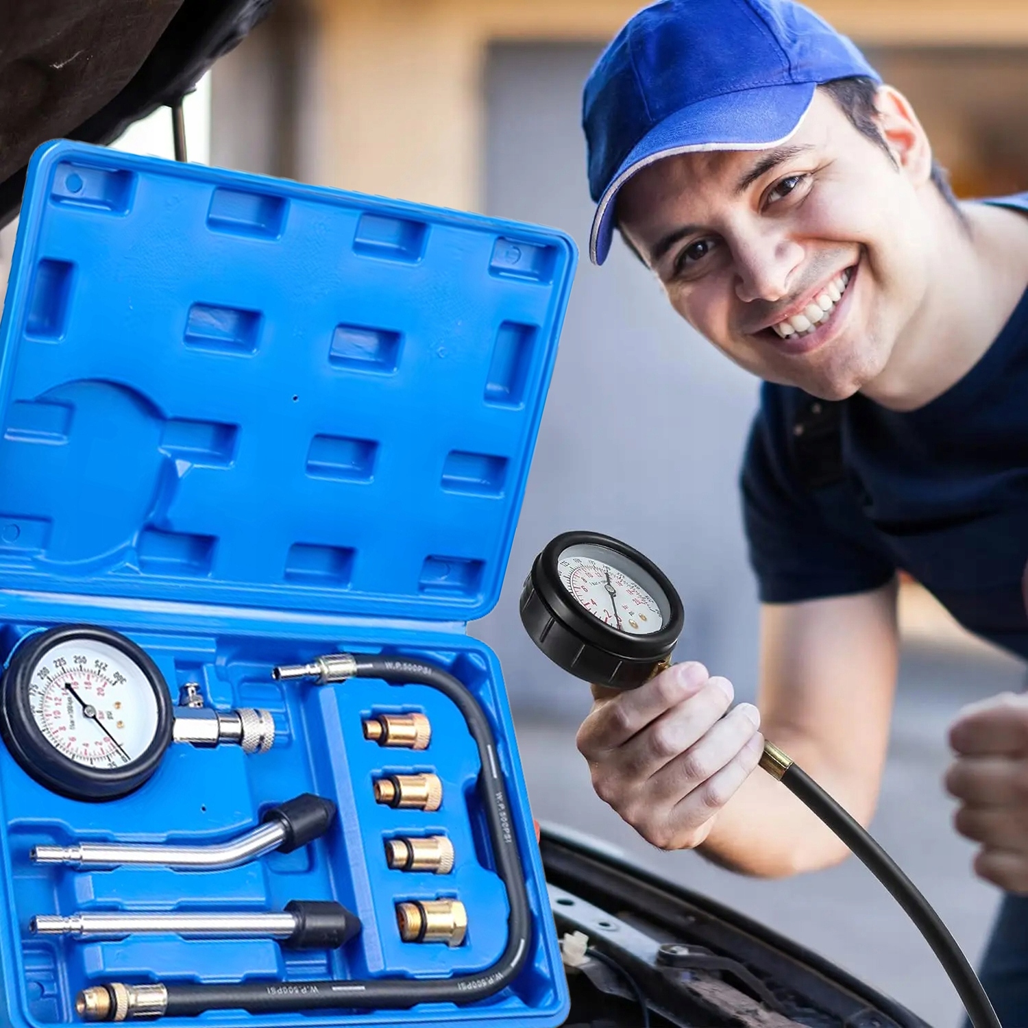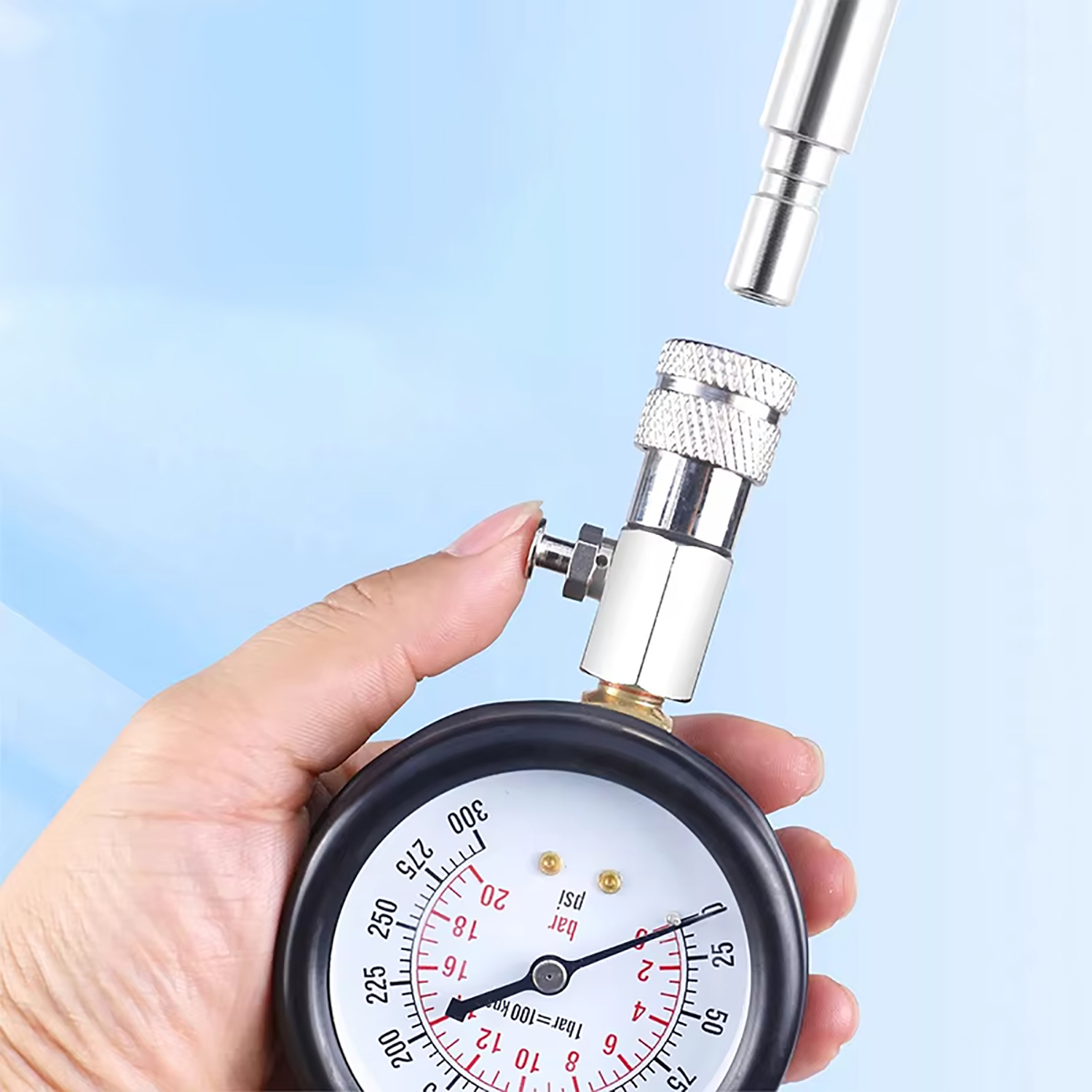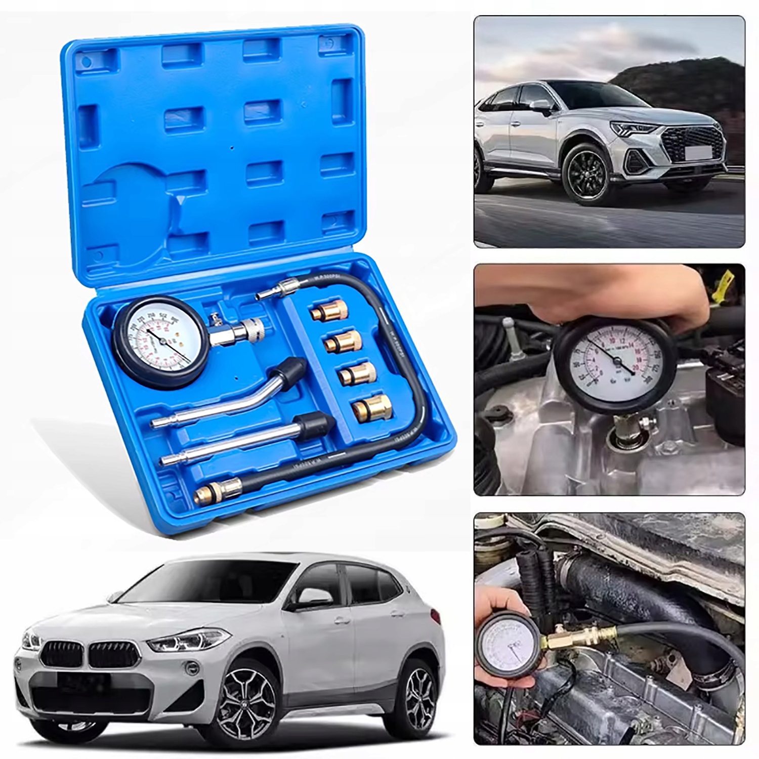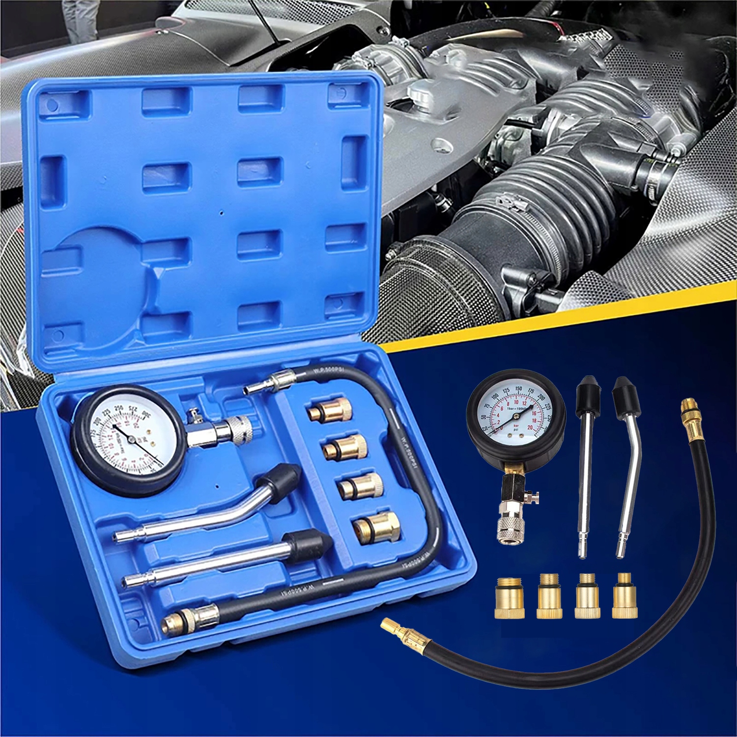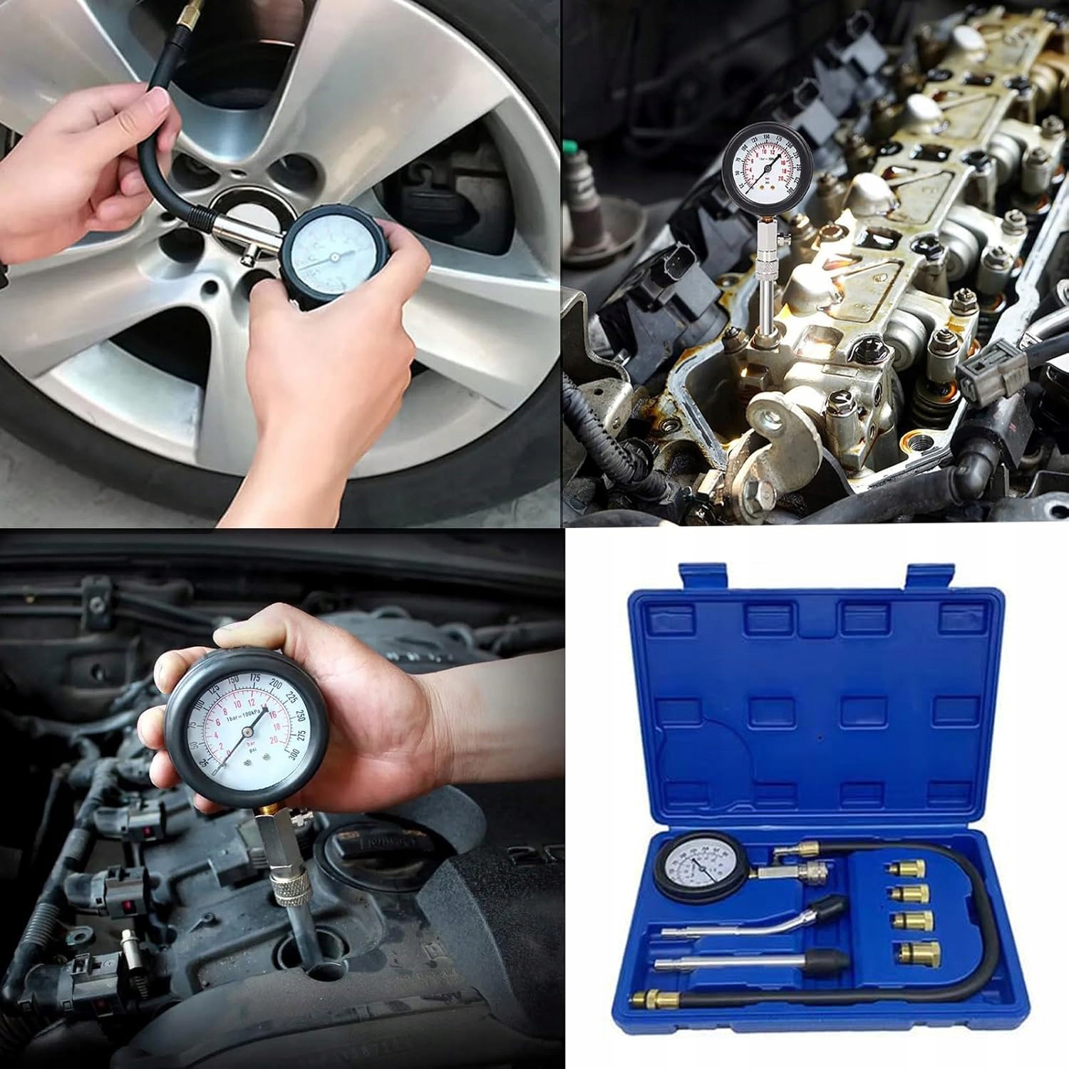 Професіоналізм: Набір ідеально підходить для тестування бензинових двигунів мотоциклів, легкових, вантажних автомобілів, позашляховиків та інших транспортних засобів. Діапазон тиску: 0-300 psi, 0-20 кг/см².