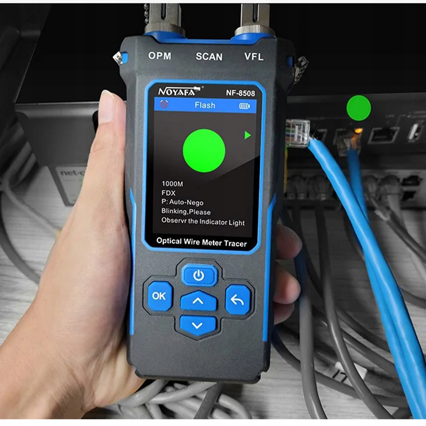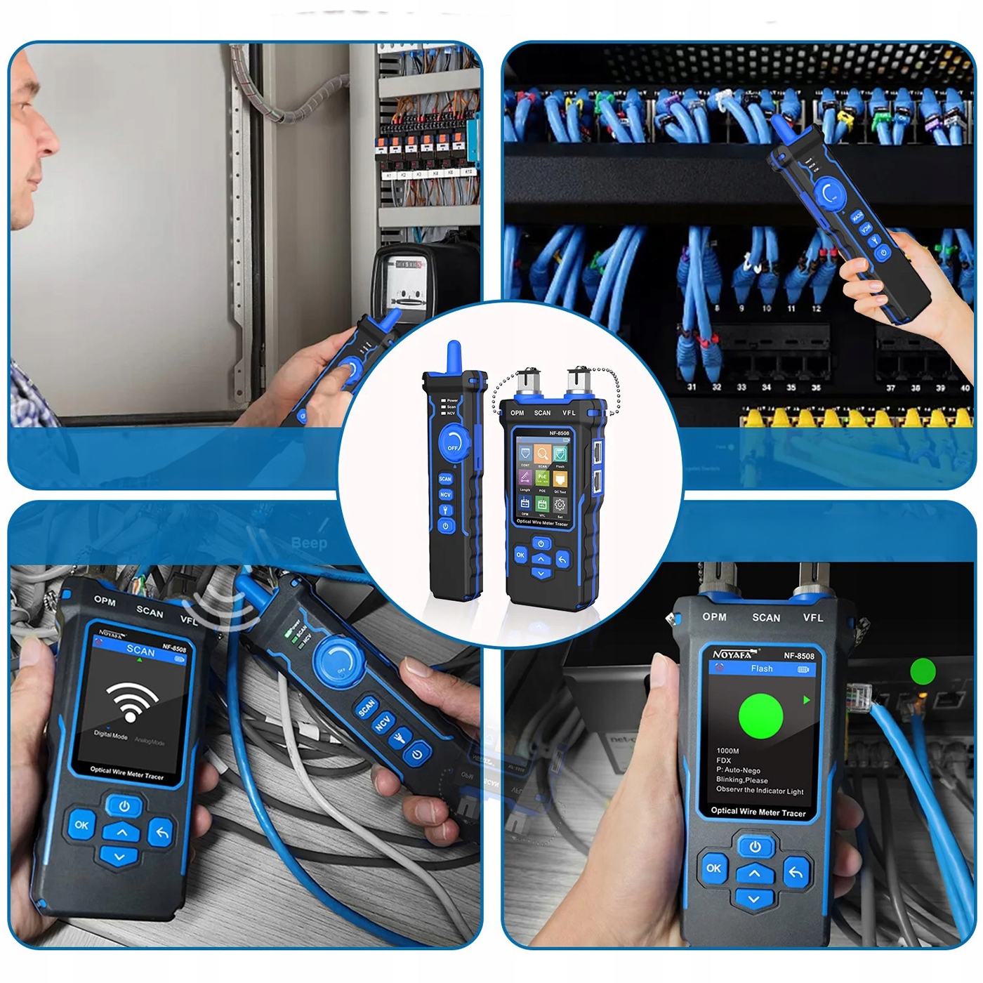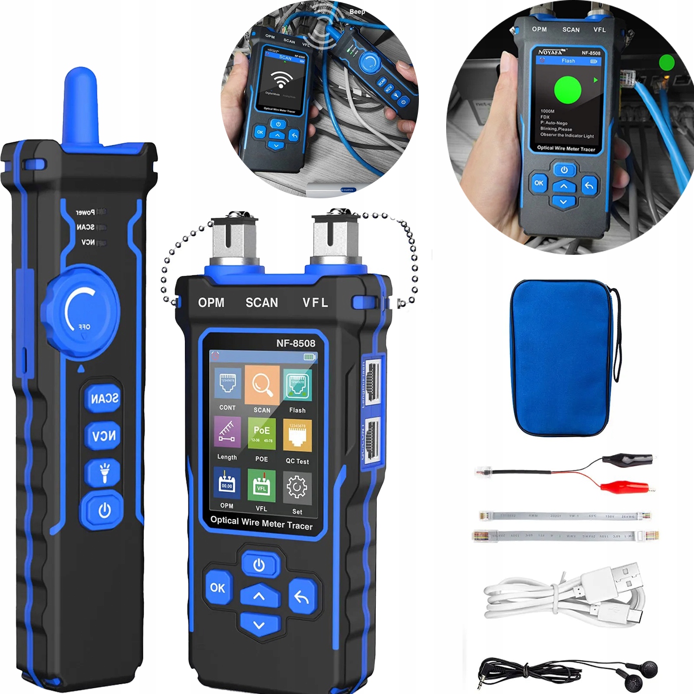 Цей тестер кабелю є універсальним діагностичним пристроєм, який поєднує в собі функції тестера мережевого кабелю та вимірювача оптичного кабелю. Завдяки вбудованому РК-екрану та живленню від батареї він пропонуєряд розширених функцій, таких як: перевірка цілісності дроту, вимірювання довжини кабелю, тестування стандартів PoE, оптичне визначення несправності та безконтактне визначення напруги. Це незамінний інструмент для мережевих інженерів і техніків, які займаються встановленням і обслуговуванням мережі.