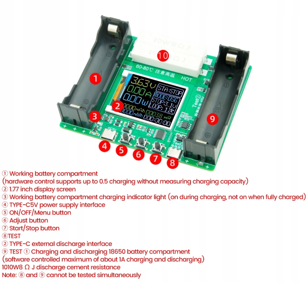 Примітка: процес заряджання та розряджання створює високі температури до 80 градусів CТри режими роботи тестера: