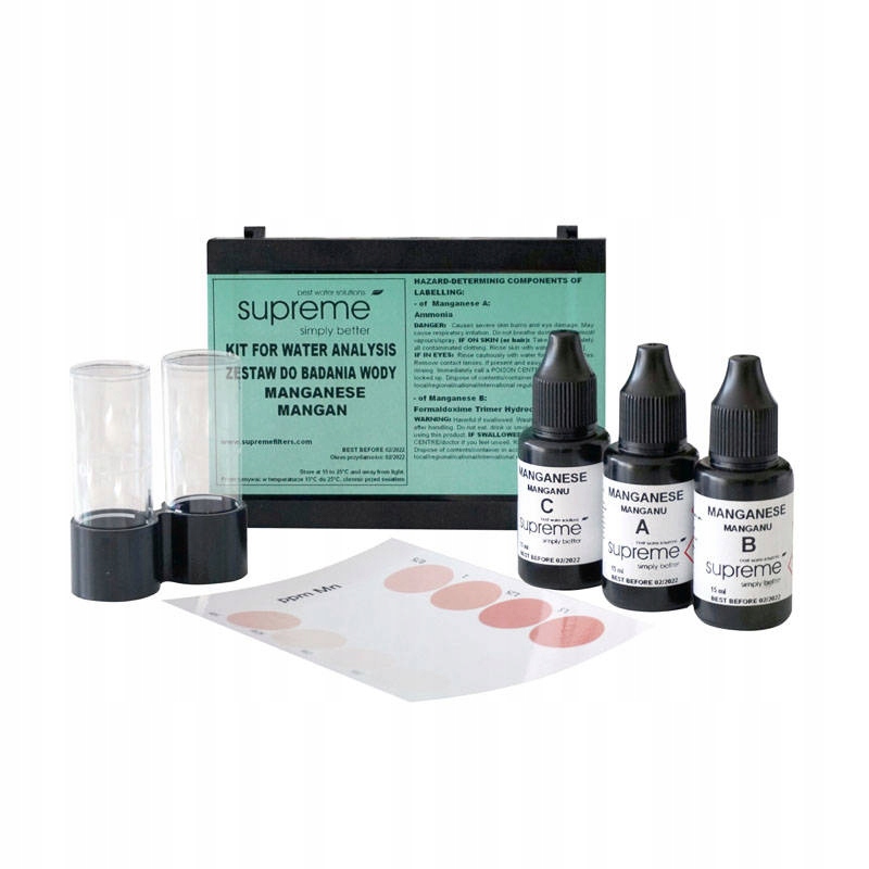 Крапельний тестер дозволяє швидко й точно вимірювати вміст марганцю у воді. У набір входять усі необхідні аксесуари для проведення тесту. Велика кількість марганцю у випитій воді може негативно позначитися на здоров'ї. Солі марганцю у великих кількостях можуть порушити правильну роботу серця, нирок і травної системи. Окрім шкоди здоров’ю, марганець також несе загрозу для нашої побутової техніки. Іони марганцю, які містяться у воді, також можуть залишати іржаві відкладення на арматурі.