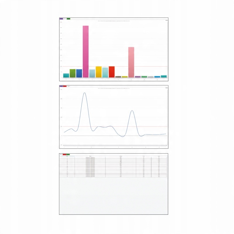 ЕКРАН 3:внизу гістограми з’являється піктограма даних. Встановлення сигнальних значень розташоване в його центральній частині. Стовпці даних за межами граничного діапазону відображаються червоним кольором. e. Чорна лінія у верхній частині гістограми вказує її діапазон для поточних даних.