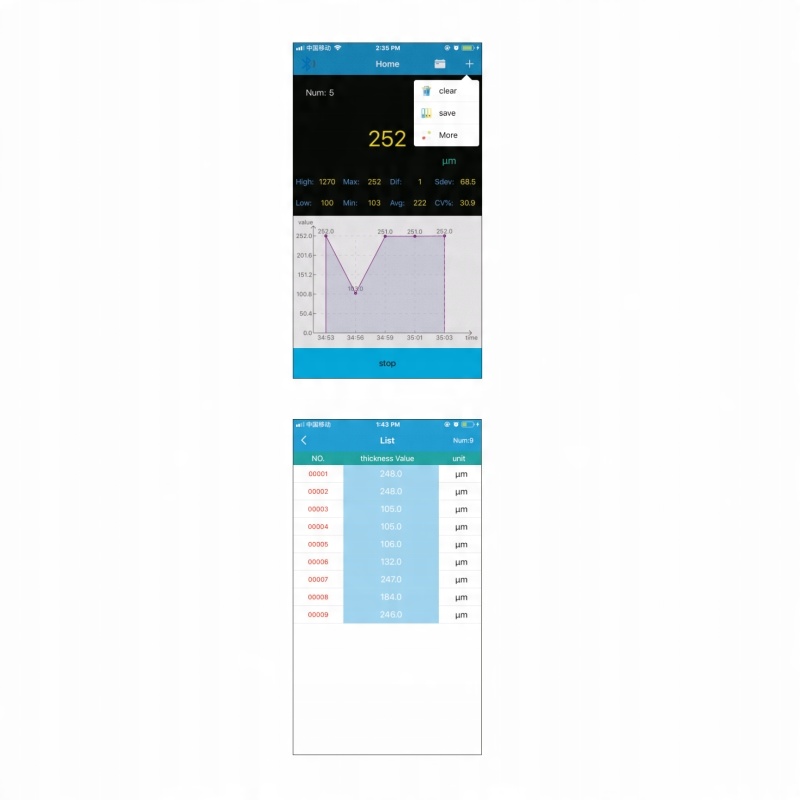 Покриття товщиномір із кольоровим і поворотним дисплеєм високої роздільної здатності та пам’яттю вимірювань і діаграмами.