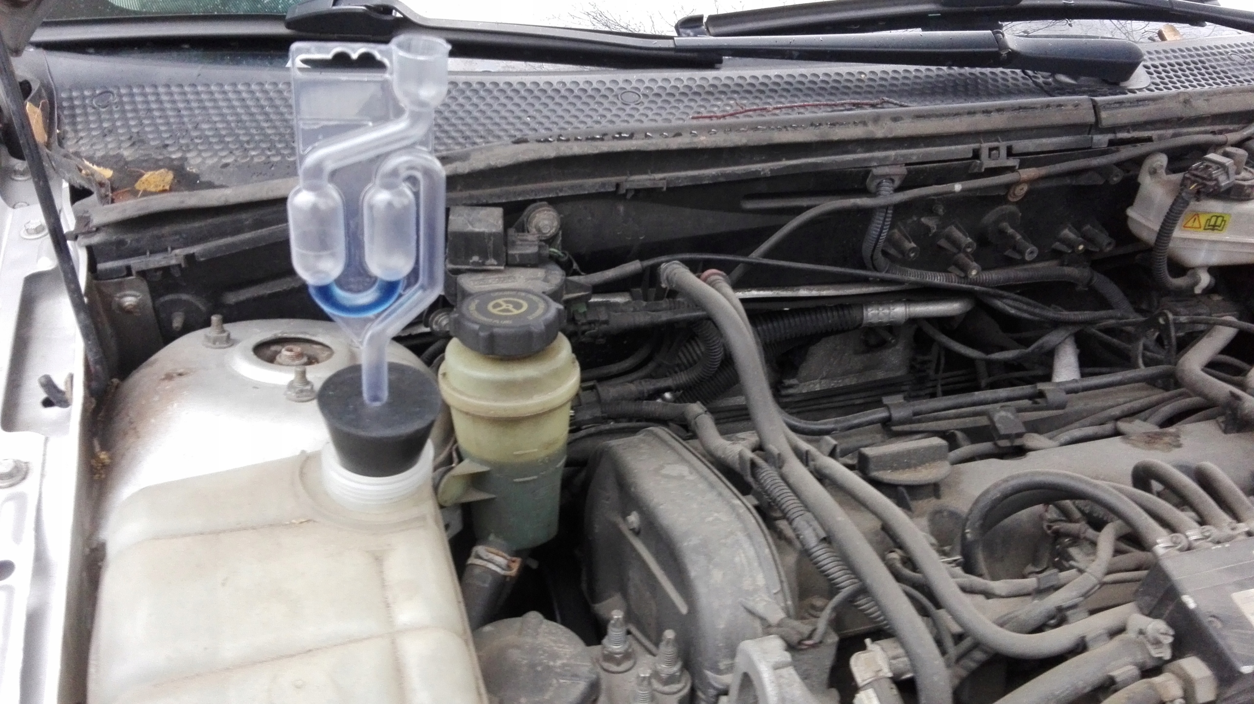 Пристрій дозволяє легко діагностувати та швидко виявити пошкодження прокладки головки. У разі пошкодження прокладки головки або самої головки частина вихлопних газів. містить, серед іншого, CO2 йде в систему охолодження. Принцип роботи приладу заснований на вимірюванні вмісту CO2 в системі охолодження. Реакційна рідина в камері тестера вступить в реакцію з газами системи охолодження і, у разі підвищеного вмісту CO2, змінить колір на жовтий, безбарвний або зелений.