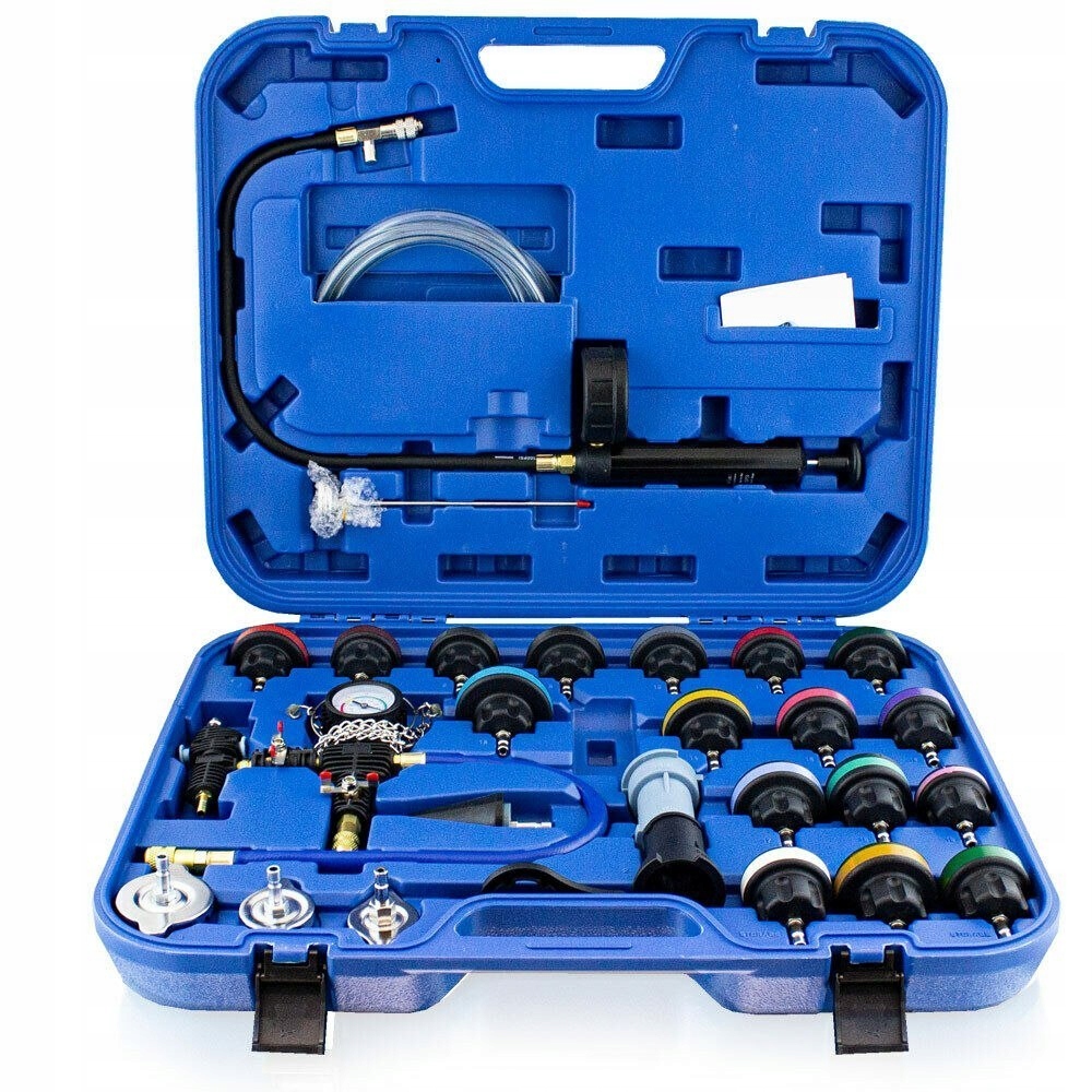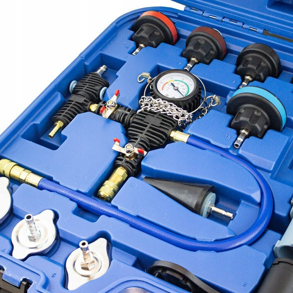 Простий і нескладний набір для перевірки системи охолодження, що складається з манометра з насосом, кришки заливної горловини та різних адаптерів для моделей транспортних засобів.