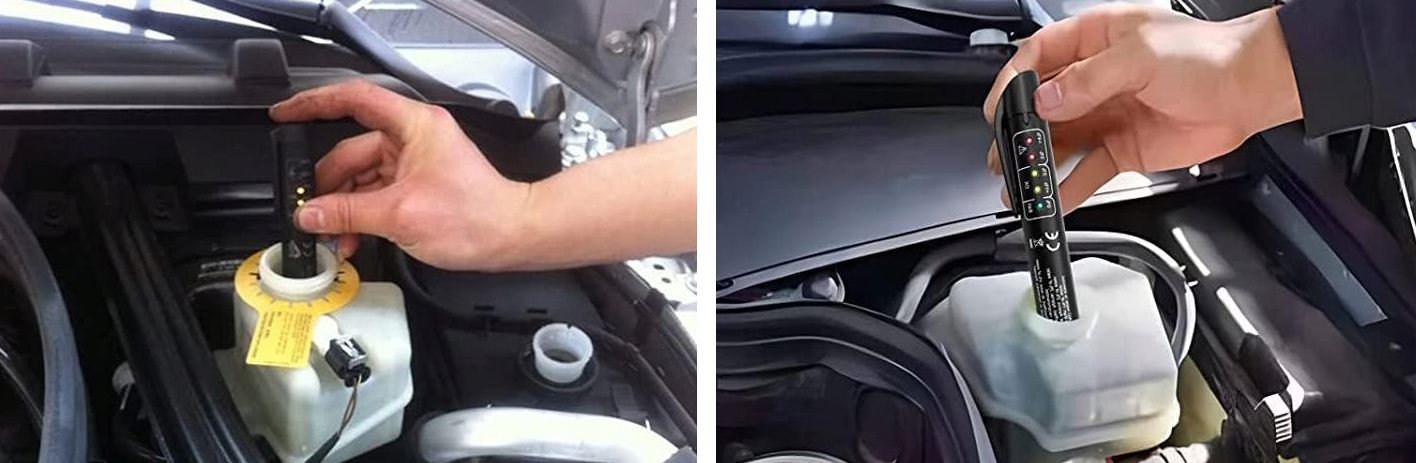 Єдине, що вам потрібно зробити, це занурити електроди тестера в резервуар з гальмівною рідиною, а потім прочитати індикацію контрольних діодів.