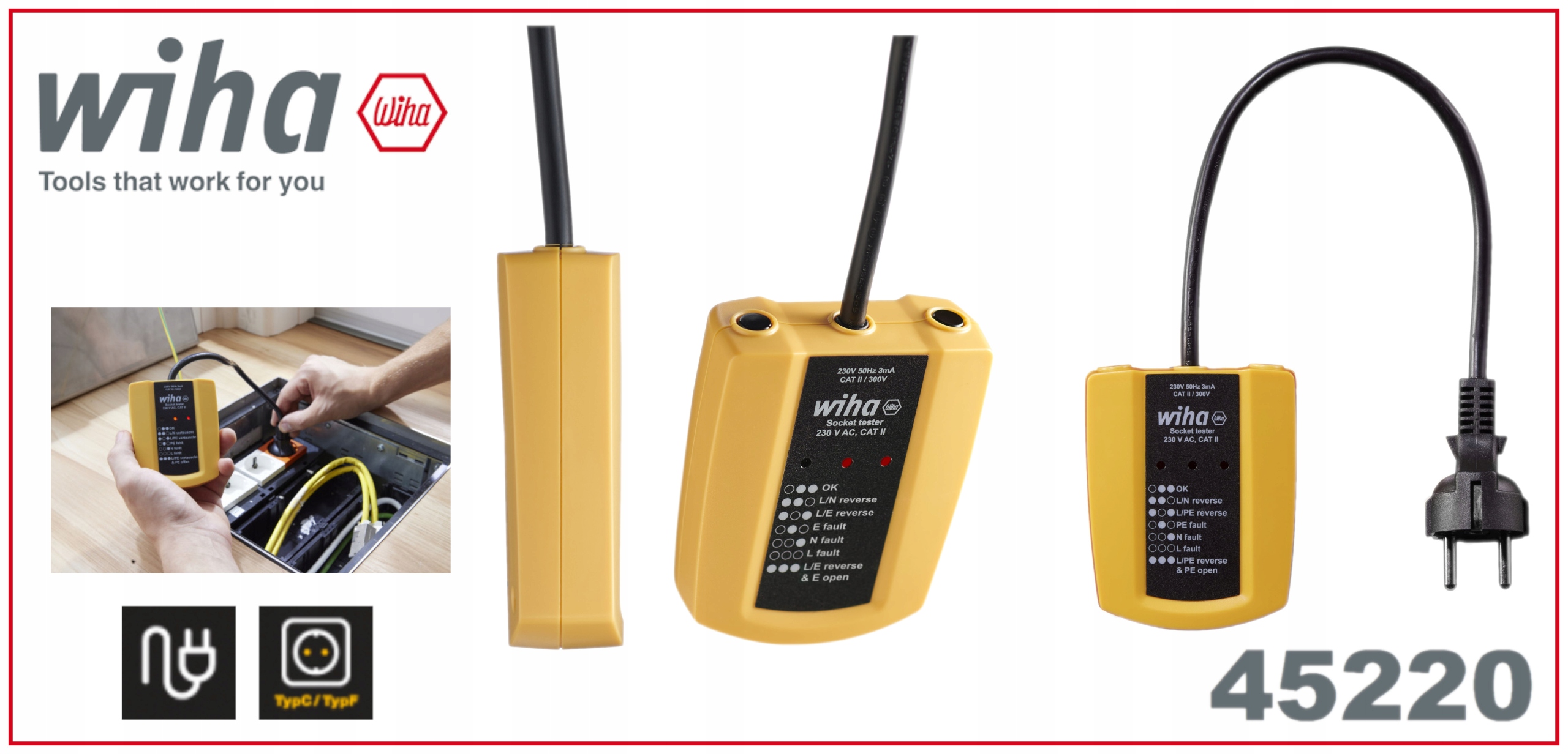 Тестер розеток WIHA 230 В змінного струму, CAT II 45220