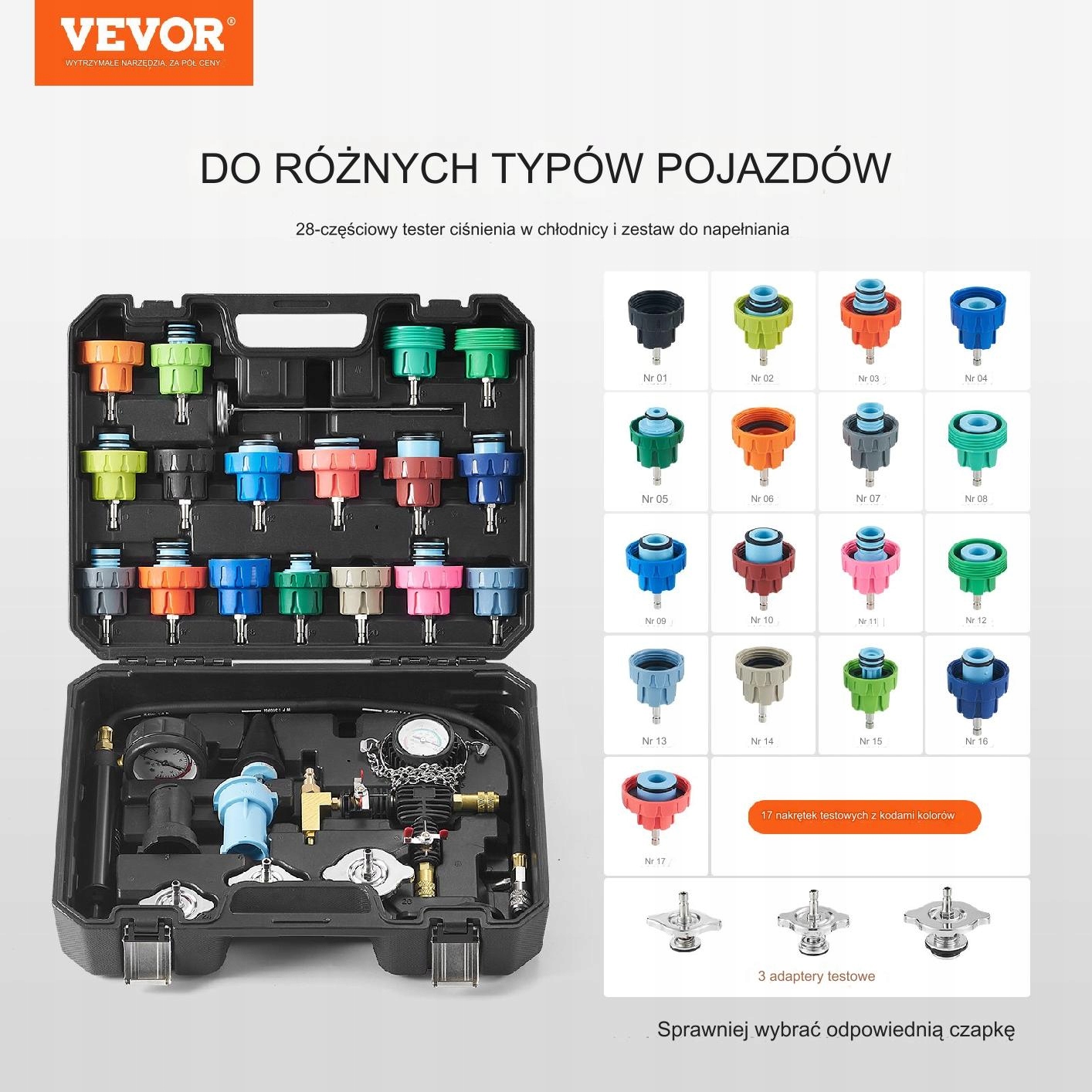 Тестер тиску охолоджуючої рідини та набір для заправки, що складається з 28 частин, створені для максимальної сумісності. Включає 17 кольорових тестових ковпачків і 3 тестові кришки, що дозволяє легко визначити правильний адаптер для вашого автомобіля. Цей комплект є ідеальним рішенням для широкого спектру моделей автомобілів - японських, європейських та американських.