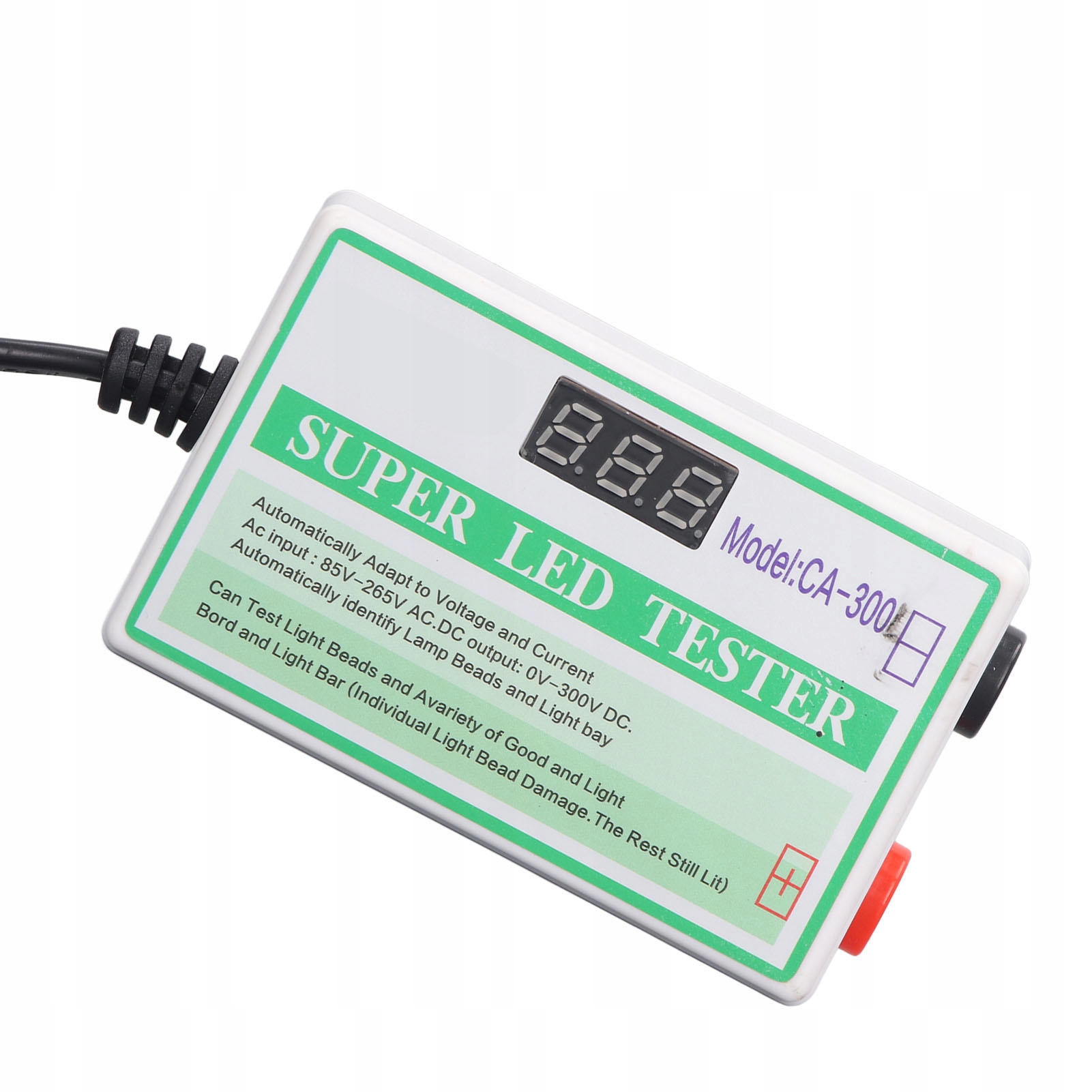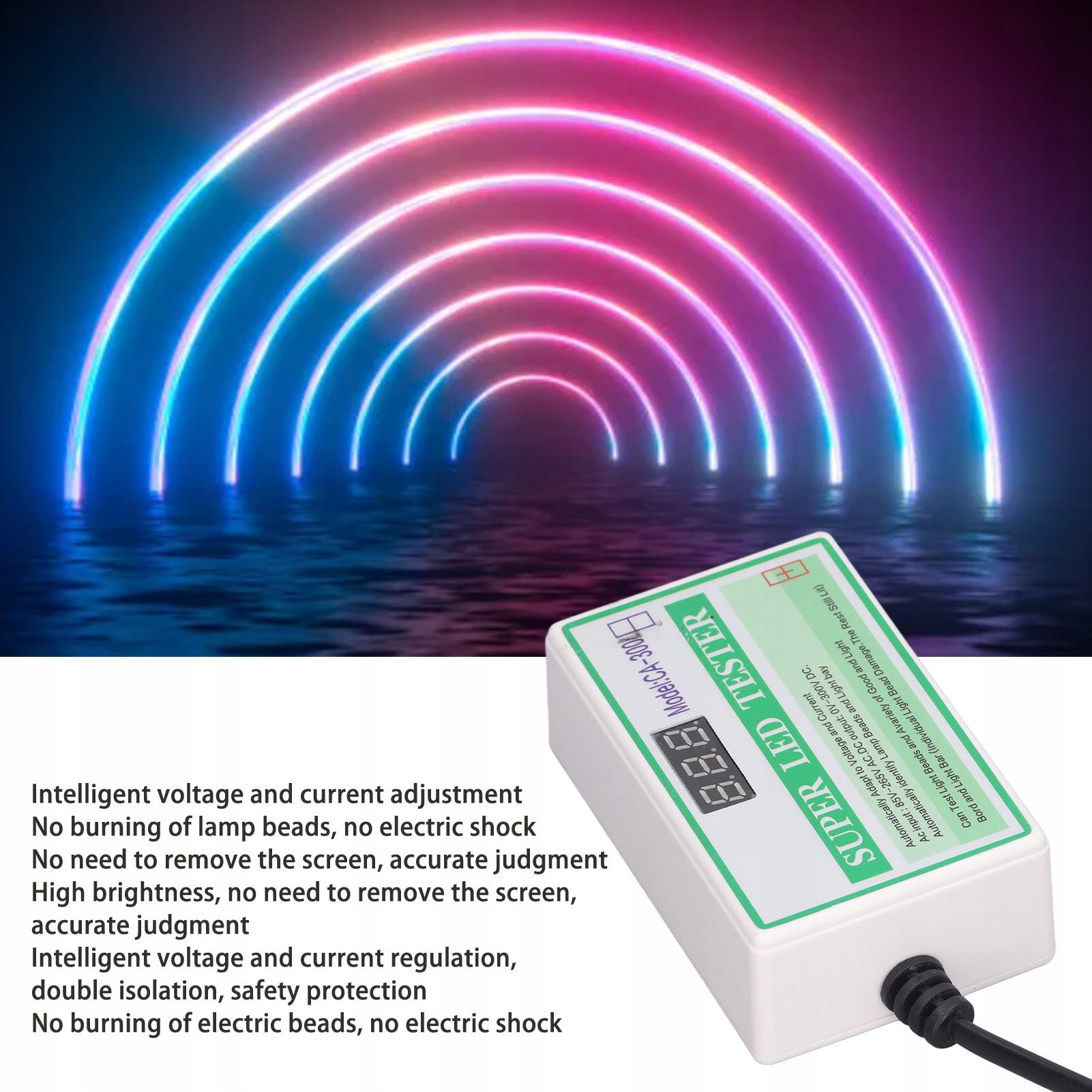 1, безкоштовне видалення екрану: цей тестер світлодіодного підсвічування має високу яскравість, відсутність потреби знімати екран, точну оцінку, безкоштовне тестування видалення екрана будь-якого розміру підсвічування світлодіодного телевізора та інших світлодіодів підсвічування. 2、Різні параметри вимірювання напруги. Тестер світлодіодного підсвічування може перевіряти параметри напруги різних компонентів, таких як регулятор напруги, значення витримуваної напруги електролітичного конденсатора. 3、Функція вольтметра постійного струму: тестер світлодіодного підсвічування перевіряє значення напруги джерела живлення постійного струму (в межах 300 В) і може використовуватися як вольтметр постійного струму для перевірки ввімкнення та витоку ланцюга. 4、Адаптивна вихідна напруга: цей тестер світлодіодного підсвічування має адаптивну вихідну напругу 0-300 В, яка регулюється автоматично під час тестування, і лампа не перегорить. 5、Простий у використанні: цей тестер світлодіодного підсвічування виготовлено з матеріалу ABS, шнур живлення вбудований у корпус, ним легко керувати, завдяки функції та робочій напрузі ви можете точно використовувати проблему.