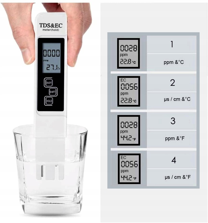 Лічильники TDS-EC прості у використанні. Просто занурте датчик у воду та прочитайте результат на дисплеї.