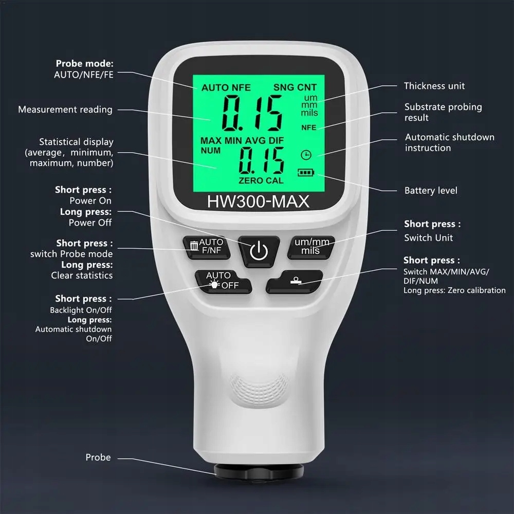 Сфера використання: Ультрапресивна роздільна здатність 1UM, Fe/NFE Вимірювання покриття, автомобільний лак 0-2000UM