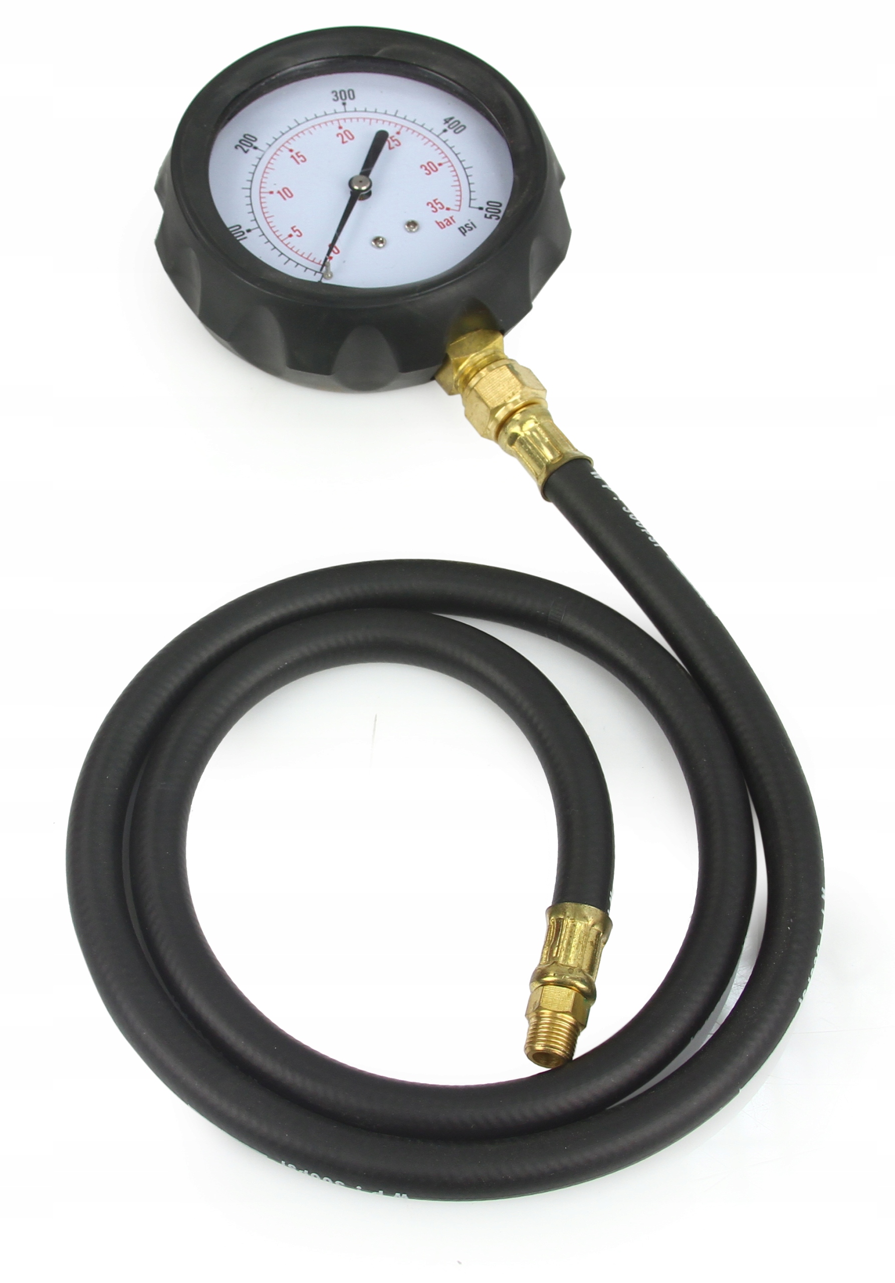- Включає манометр із точною шкалою 0–500 psi (0–35 бар) і шланг довжиною 600 мм