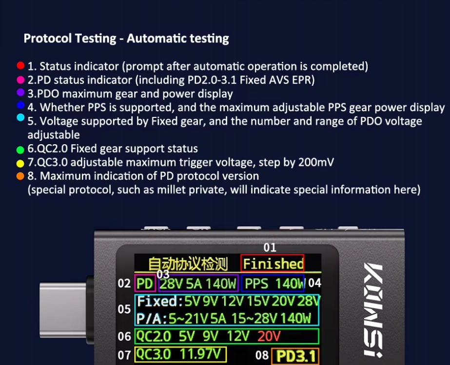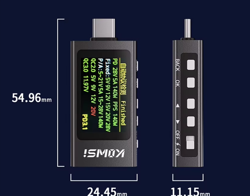 Універсальні можливості вимірювання: тестер може вимірювати напругу, струм і підтримує протоколи швидкого заряджання, що робить його універсальним інструментом для тестування та відключення ємності широкого діапазону пристроїв.