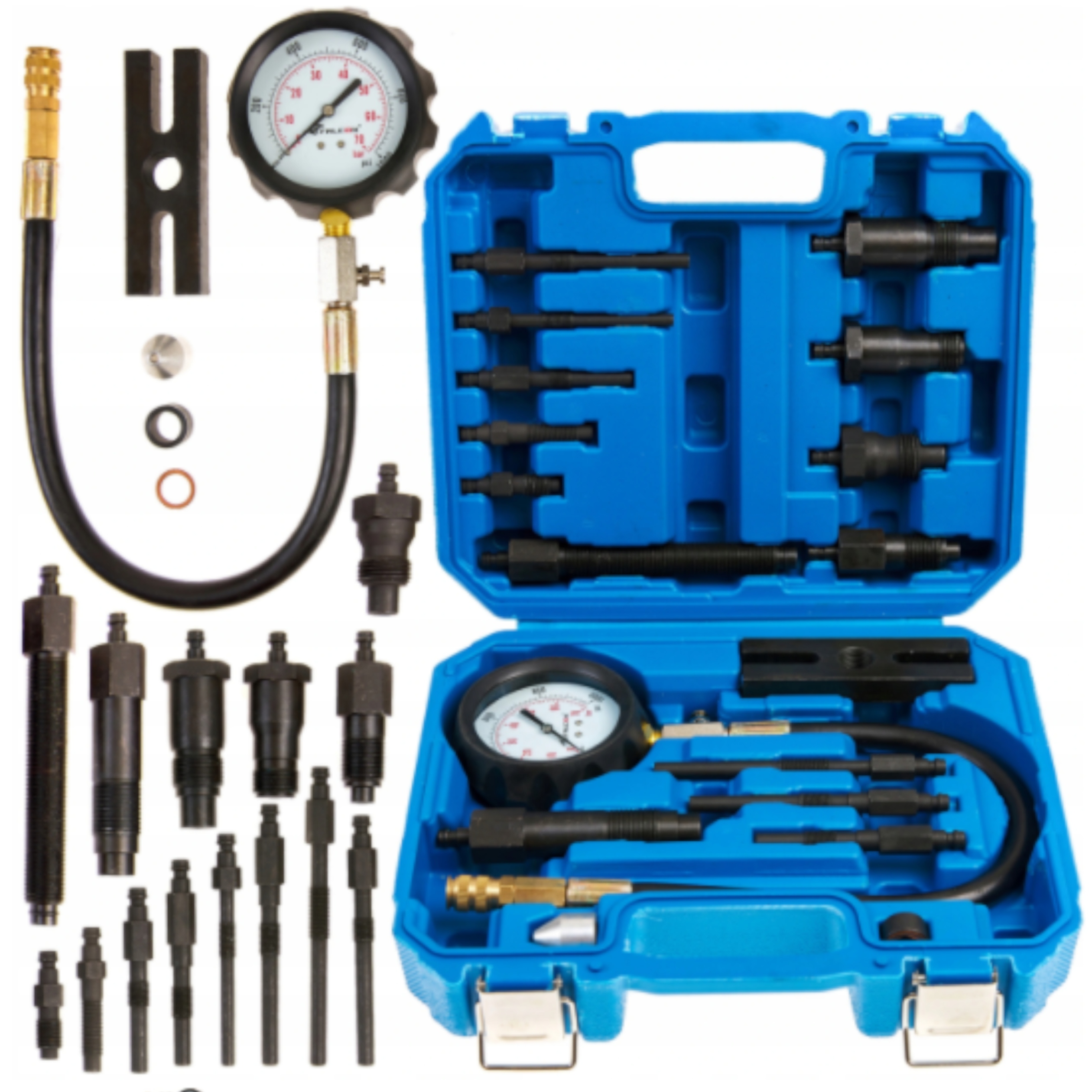 Тестер призначений для вимірювання ступеня стиснення в циліндрах дизельних двигунів з прямим і непрямим уприскуванням. Манометр із подвійною шкалою Bar і PSI, оснащений тестовим клапаном для контролю.