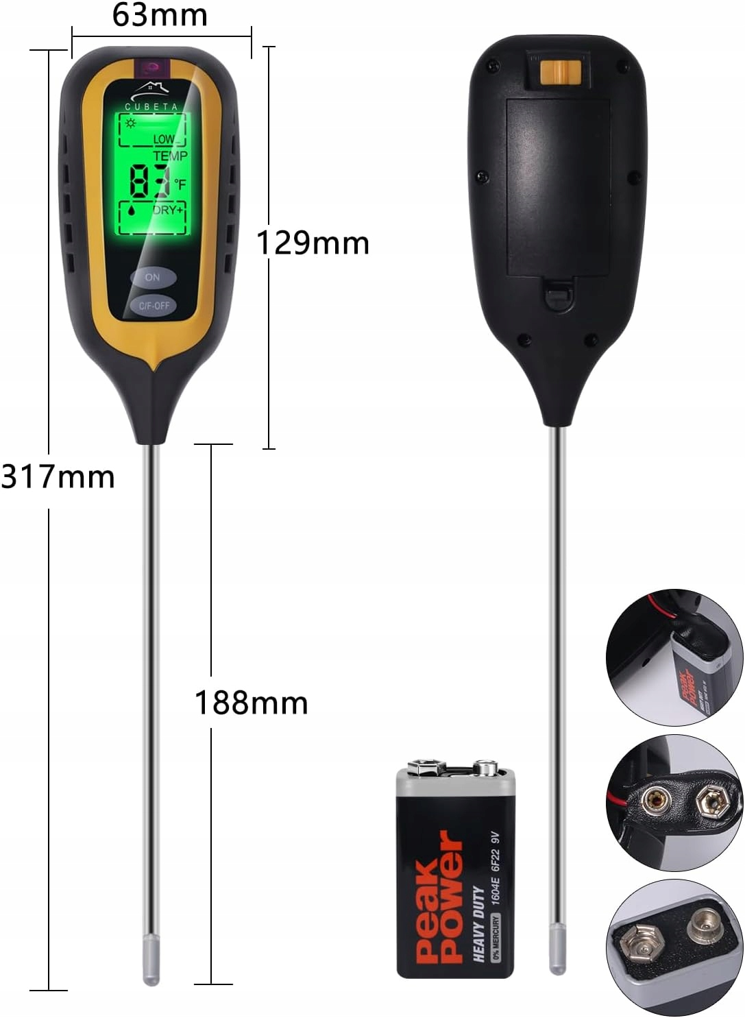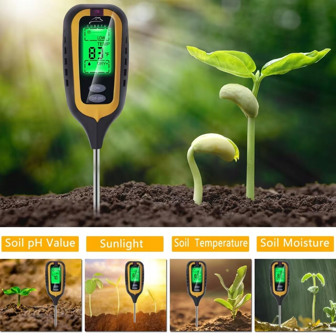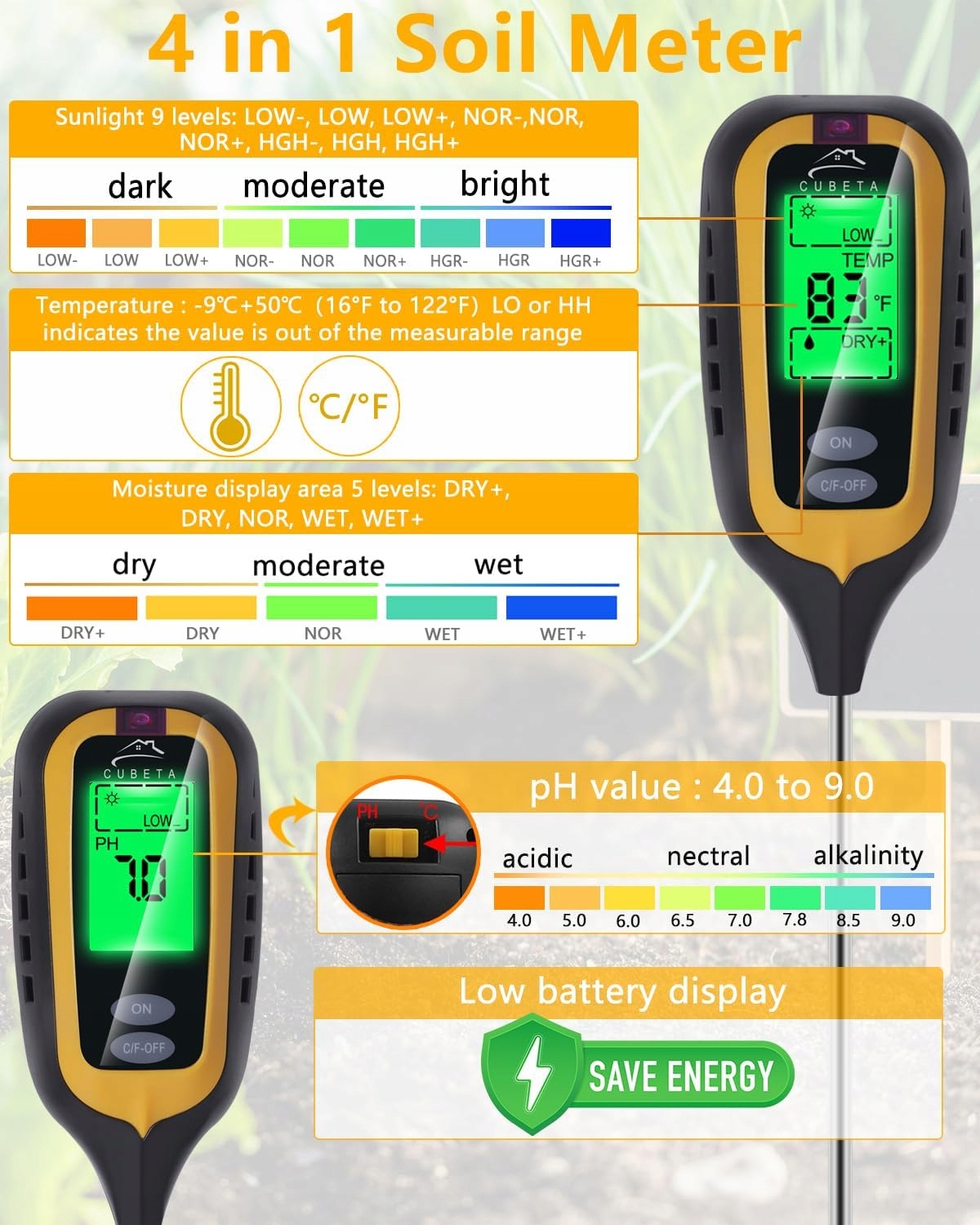 - Вимірювач ґрунту 4-в-1: цей нещодавно розроблений вимірювач ґрунту для рослин є універсальним інструментом, який вимірює рН, світло та температуру – все в одному пристрої. Це допомагає вашим рослинам рости здорово.