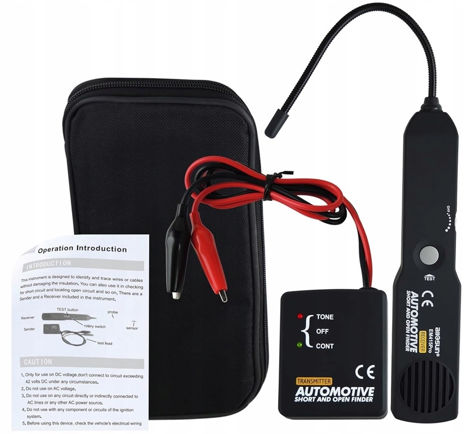 У режимі TONE під’єднайте червоний провід передавача до підозрілого дроту, а чорний – до заземлення автомобіля. Потім перемістіть щуп приймача вздовж дроту - коли аудіосигнал зникне, знайдено обрив.