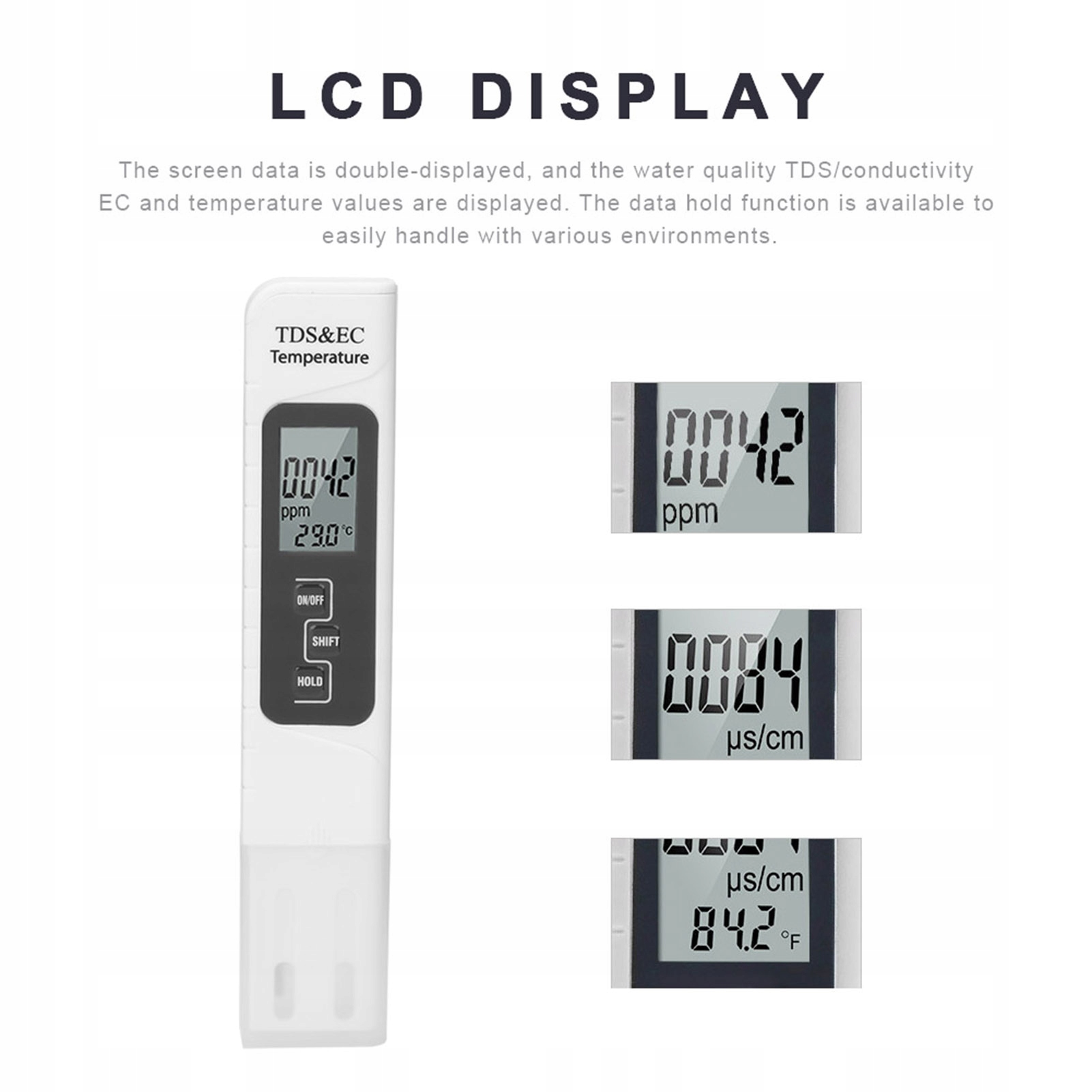 3. РК -дисплей для легкого зчитування дані екрана подвоюються, а якість провідності води/EC провідності та температури відображаються.