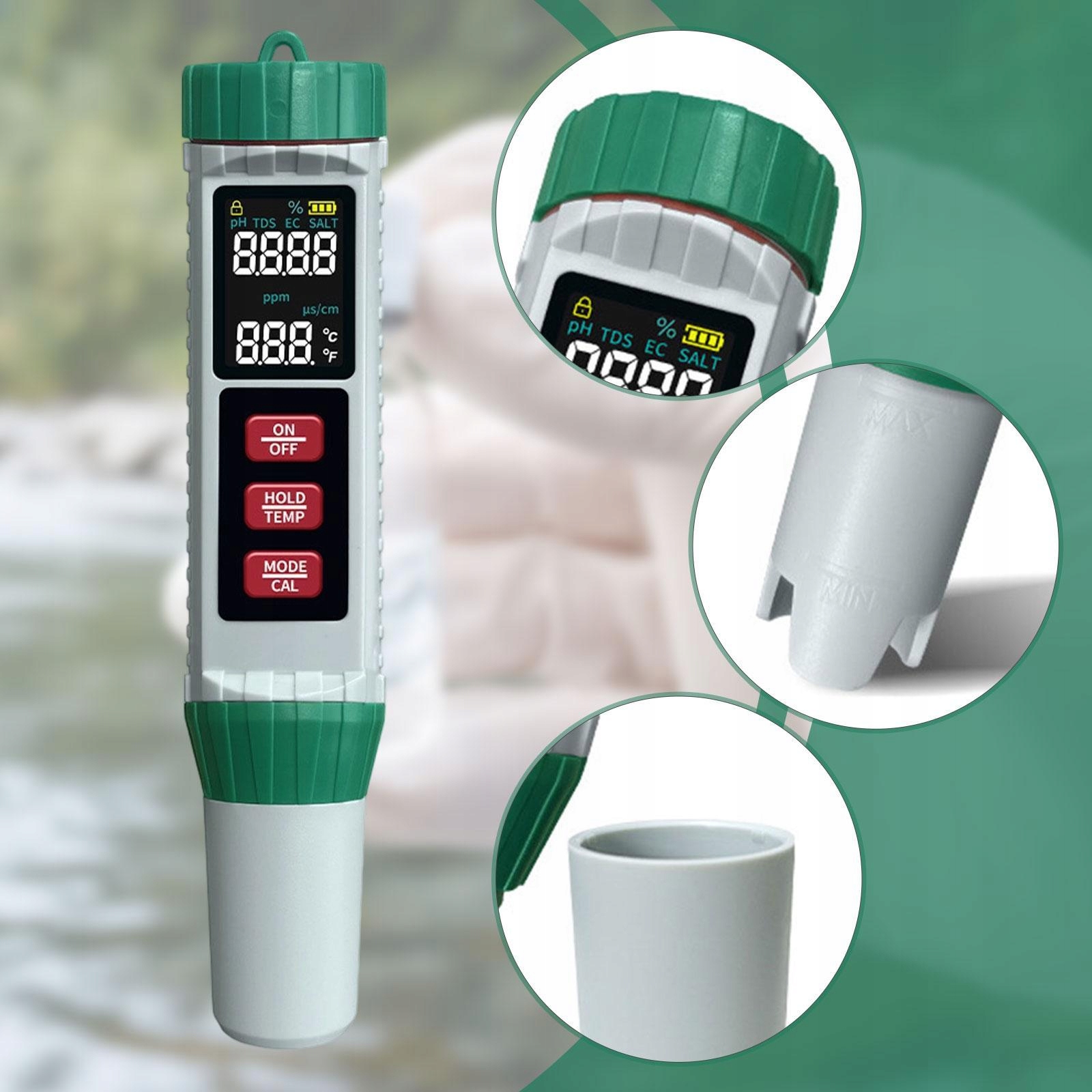 [5 в 1]: професійний тестер якості води, має функції температури (°C/°F перемикач), електропровідності, TDS і PH.