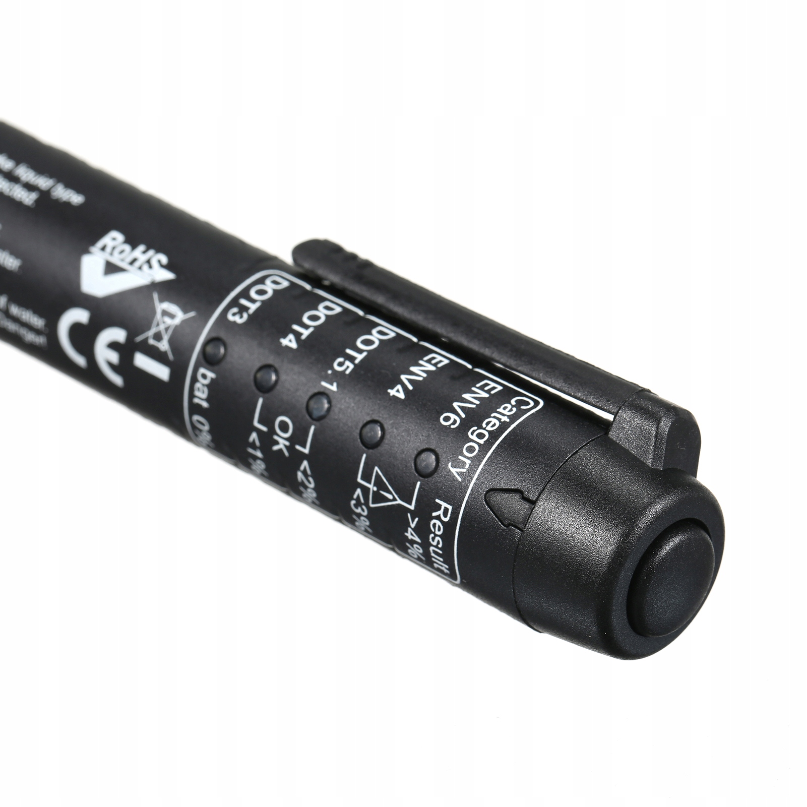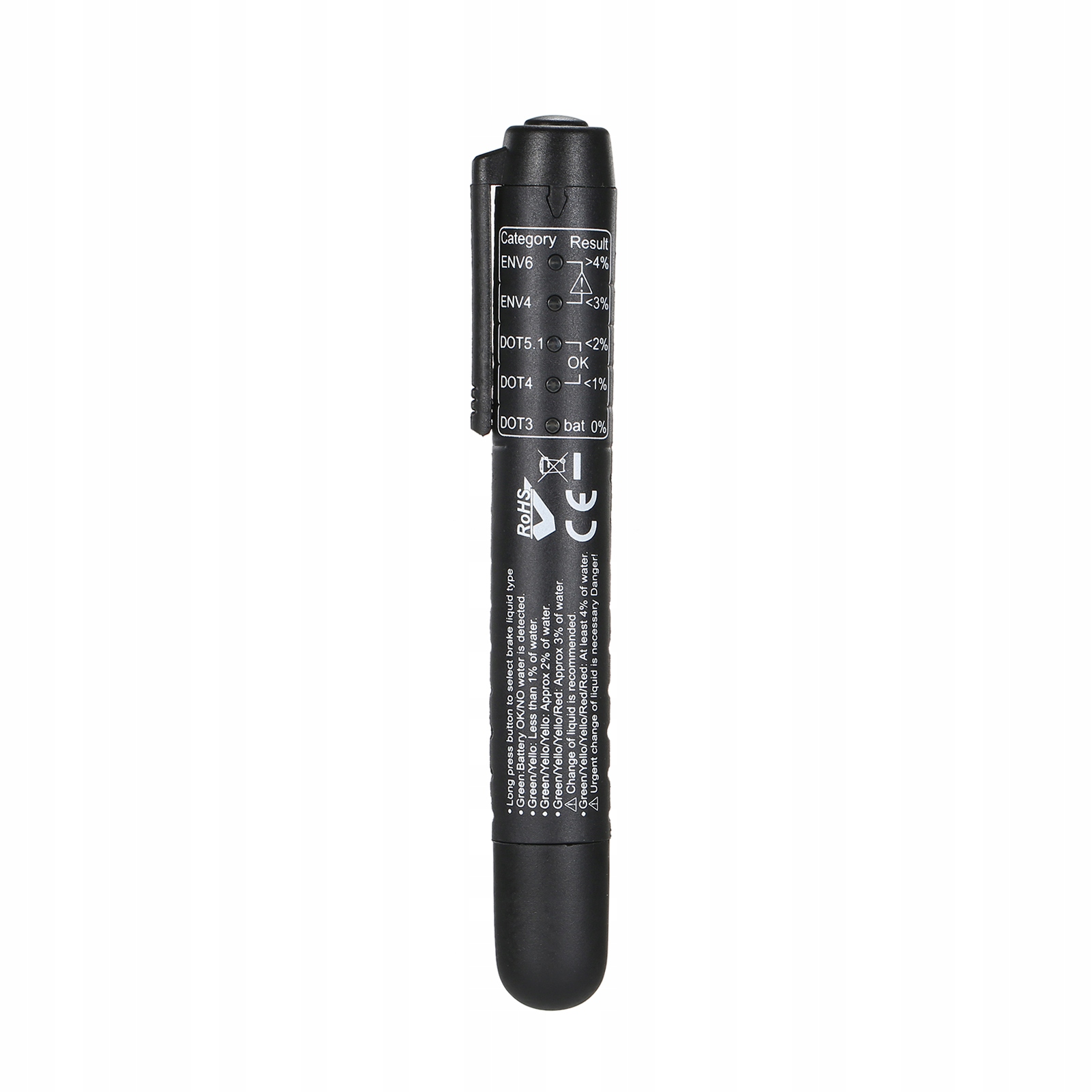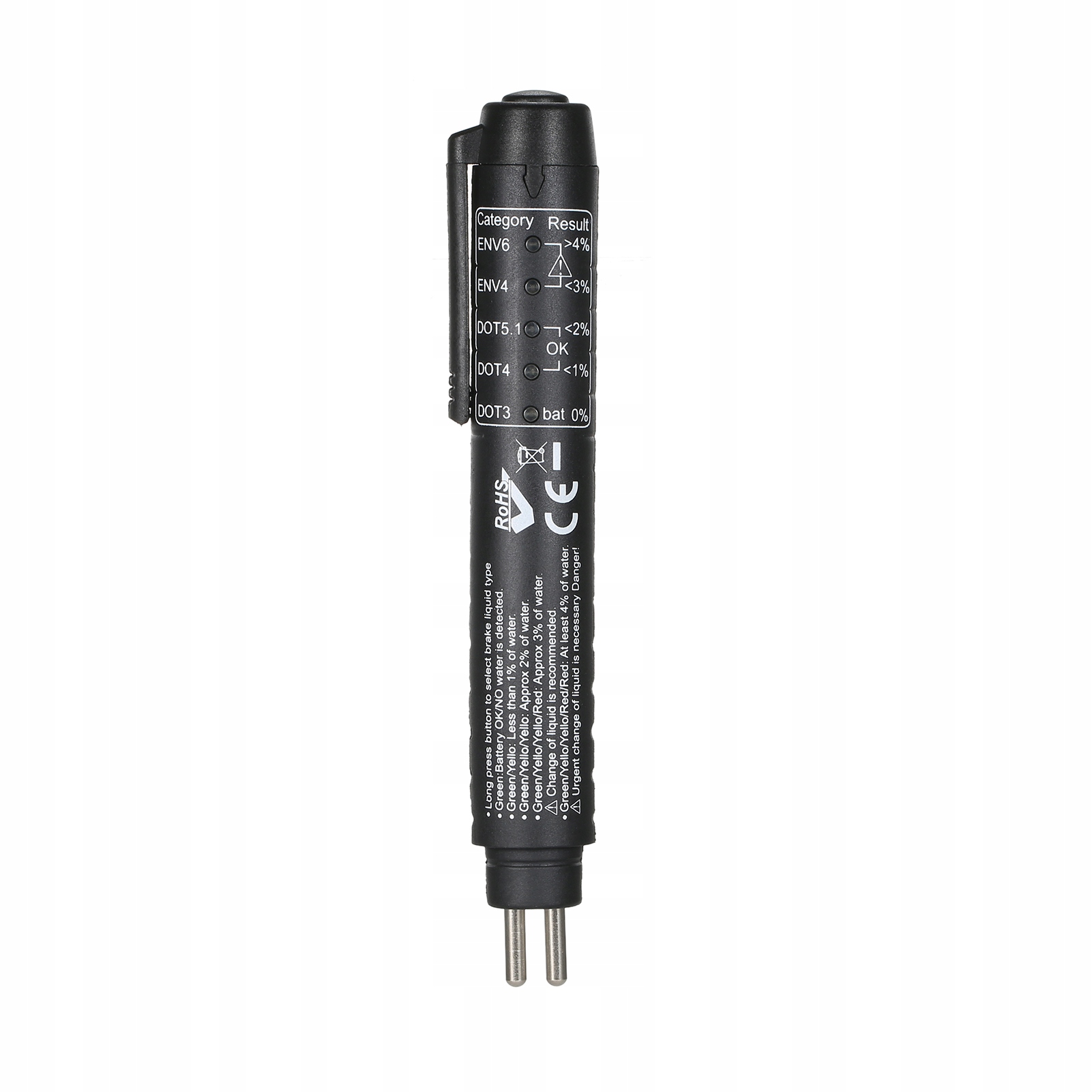 - Ручка для тестера гальмівної рідини. Ми широко тестуємо відсоток вологи в DOT3 DOT4.1 ENV6 ENV6 HAMURE РИСКА. Простий і швидкий. Результат з’являється за кілька секунд.