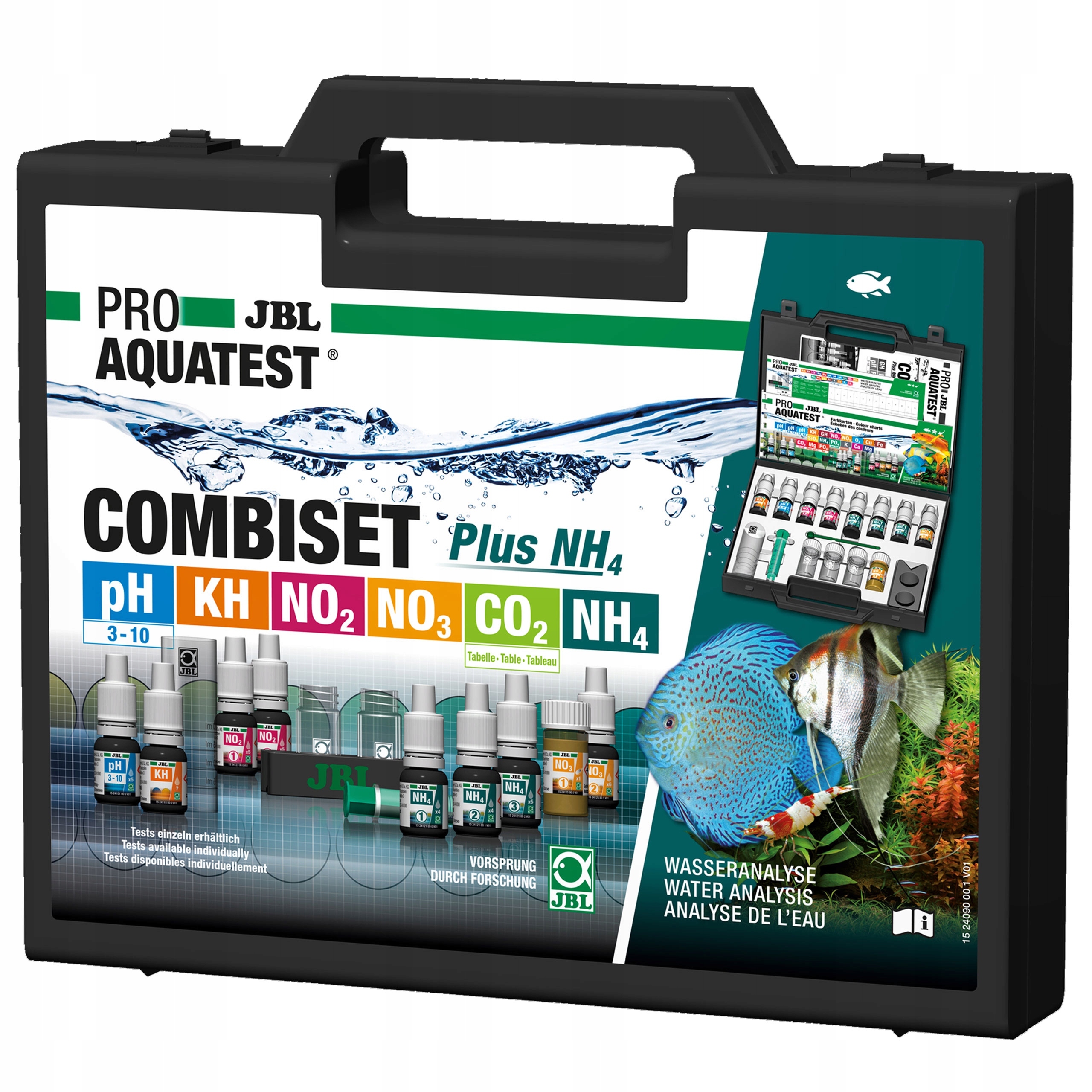 JBL PROAQUATEST COMBISET Plus NH4 - набір для тестування акваріума у валізі Тестовий кейс для найважливіших параметрів води в прісноводних акваріумах, включаючи набір для тестування амонію. Простий і безпечний контроль параметрів води в акваріумі. Визначені параметри: значення рН, карбонатна жорсткість, нітрити, нітрати та додатково амоній/аміак, розрахунок CO2 з таблиці. Просте використання: налийте шприцом акваріумну воду в кювету, додайте реагент і порівняйте колір з кольоровою шкалою або під час KH-тесту рахуйте краплі до зміни кольору. Ця система порівняння враховує колір води. Вміст CO2 визначається з таблиці через значення pH і KH. Пляшки з реактивами, безпечні для дітей, водонепроникний пластиковий футляр, реагенти в упаковці для заправки доступні окремо. У набір входить: 1 тестовий ящик для акваріума. 9 реактивів, 3 скляні кювети, шприц, дозувальні ложечки, порівняльний блок, пластикова кювета, кольорові картки, картки протоколів, інструкція користувача