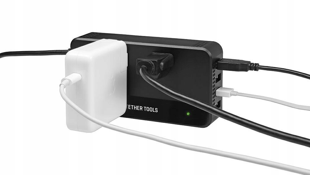 Інструменти Tether Tools ONsite D-Tap to AC Power Supply – це портативний блок живлення змінного струму. Після підключення батареї за допомогою роз’єму D-Tap (сумісного з роз’ємом V-Mount і Gold Mount) ви можете живити такі пристрої, як ноутбуки, зарядні пристрої, планшети тощо. Він має дві розетки змінного струму та 4 порти USB, тому може живити кілька пристроїв одночасно. Завдяки кріпленню ONsite Aero V-Mount його можна встановити на систему кріплення ноутбука Tether Table Aero та безпечно живити ноутбук під час тривалих фотосесій. Користувачі з блоками живлення потужністю 85 Вт або вище можуть відчувати переривчасте заряджання (плаваюче заряджання) залежно від використовуваних програм.