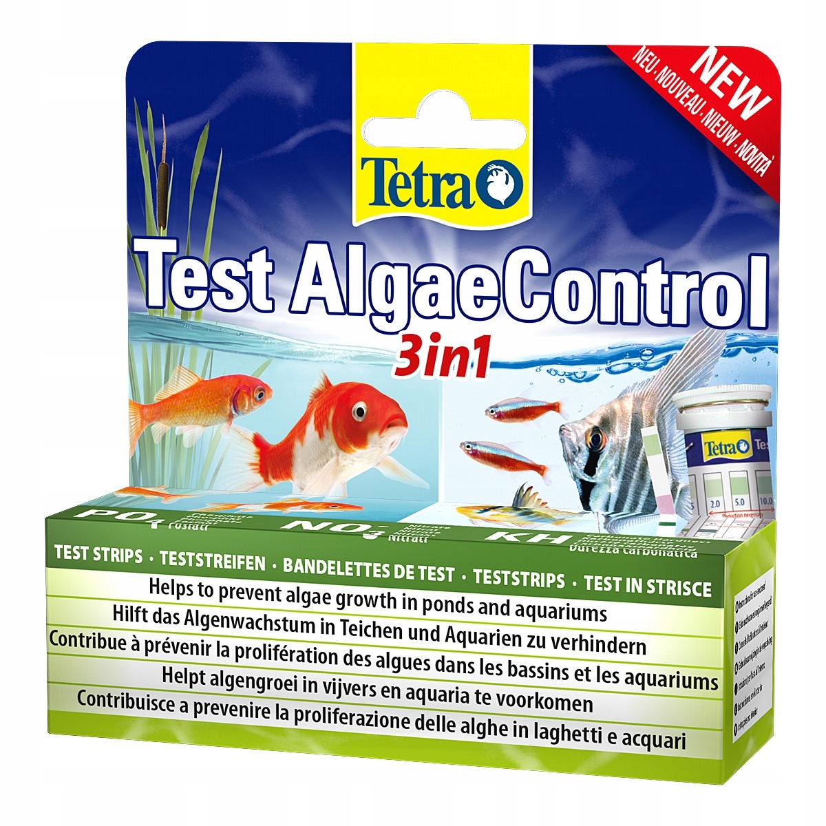 Tetra Test AlgaeControl 3in1 — це оптимальний засіб для запобігання росту водоростей у ставках і акваріумах. Вимірювання вмісту нітратів і фосфатів у воді полегшує контроль найважливіших параметрів водоростей, що знаходяться у воді. Карбонатна жорсткість також вимірюється, і це дуже важливо для забезпечення стабільних параметрів води, запобігаючи раптовому падінню кислотності.