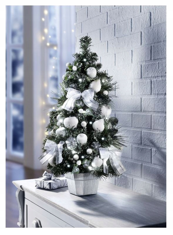 Ялинку прикрашають білими яблуками, шишками, бантом в тон і штучним снігом. Ялинка особливо гарно сяє завдяки вбудованому 20-точковому світловому ланцюжку.