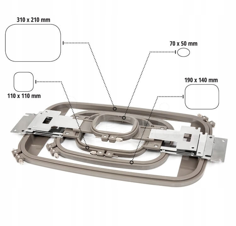 - п’яльця для вишивання та розміри: 310 x 210 мм, 190 x 140 мм, 110 x 110 мм і 70 x 50 мм