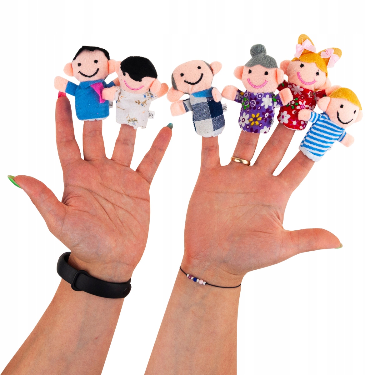 - СІМЕЙНА КОЛЕКЦІЯ – набір включає 6 ляльок-людей, які поміщаються на кожен палець руки; ми можемо грати кількома пальцями, що підвищує привабливість і робить театр цікавішим і дає можливість розвивати історію; ви також можете грати з ляльками у більшій групі; Ляльки підходять для рук маленьких дітей, а також для маленьких рук дорослих.