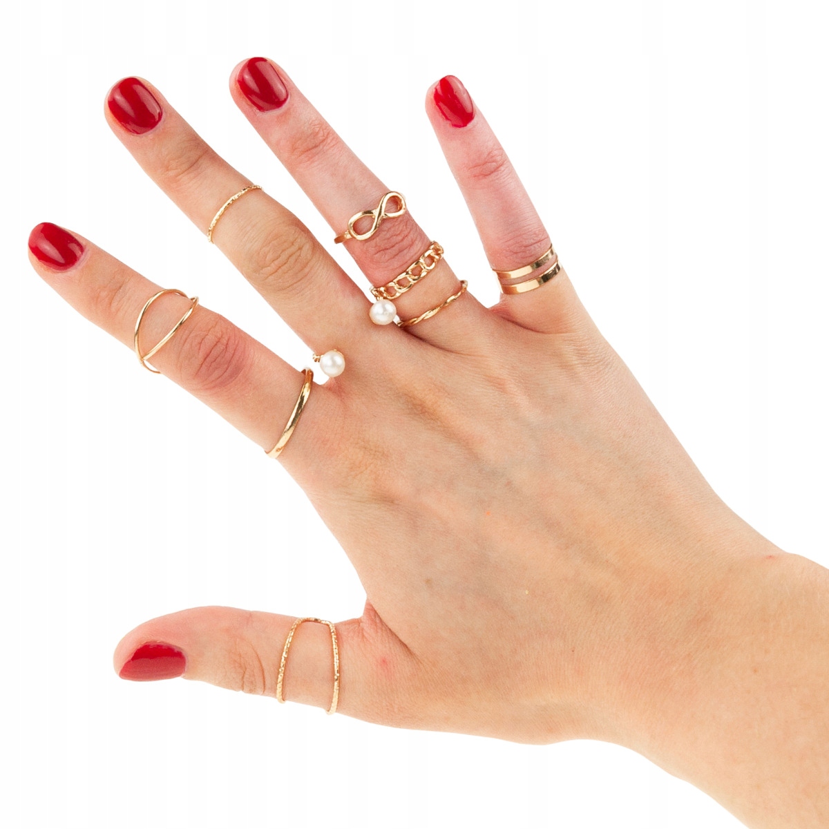 Цей набір включає різні кільця та обручки, прикрашені синтетичними перлами. Це набір золотих кілець, , який можна носити на всіх пальцях під рукою.