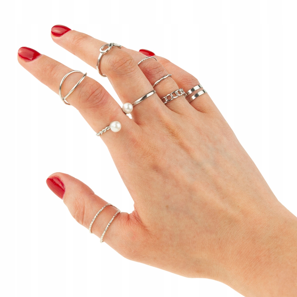 У набір входять різноманітні каблучки та обручки, прикрашені синтетичними перлами. Це набір срібних кілець, які можна носити на всіх пальцях руки.