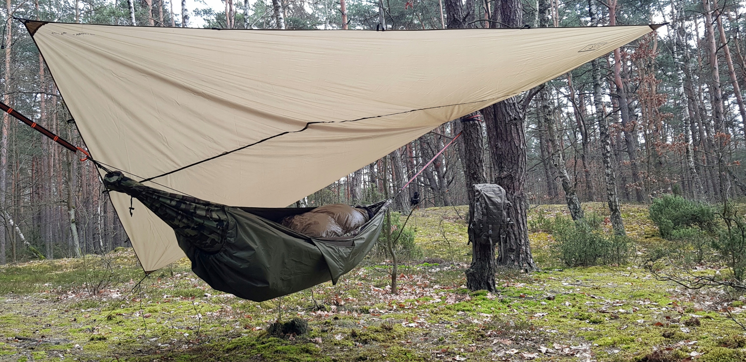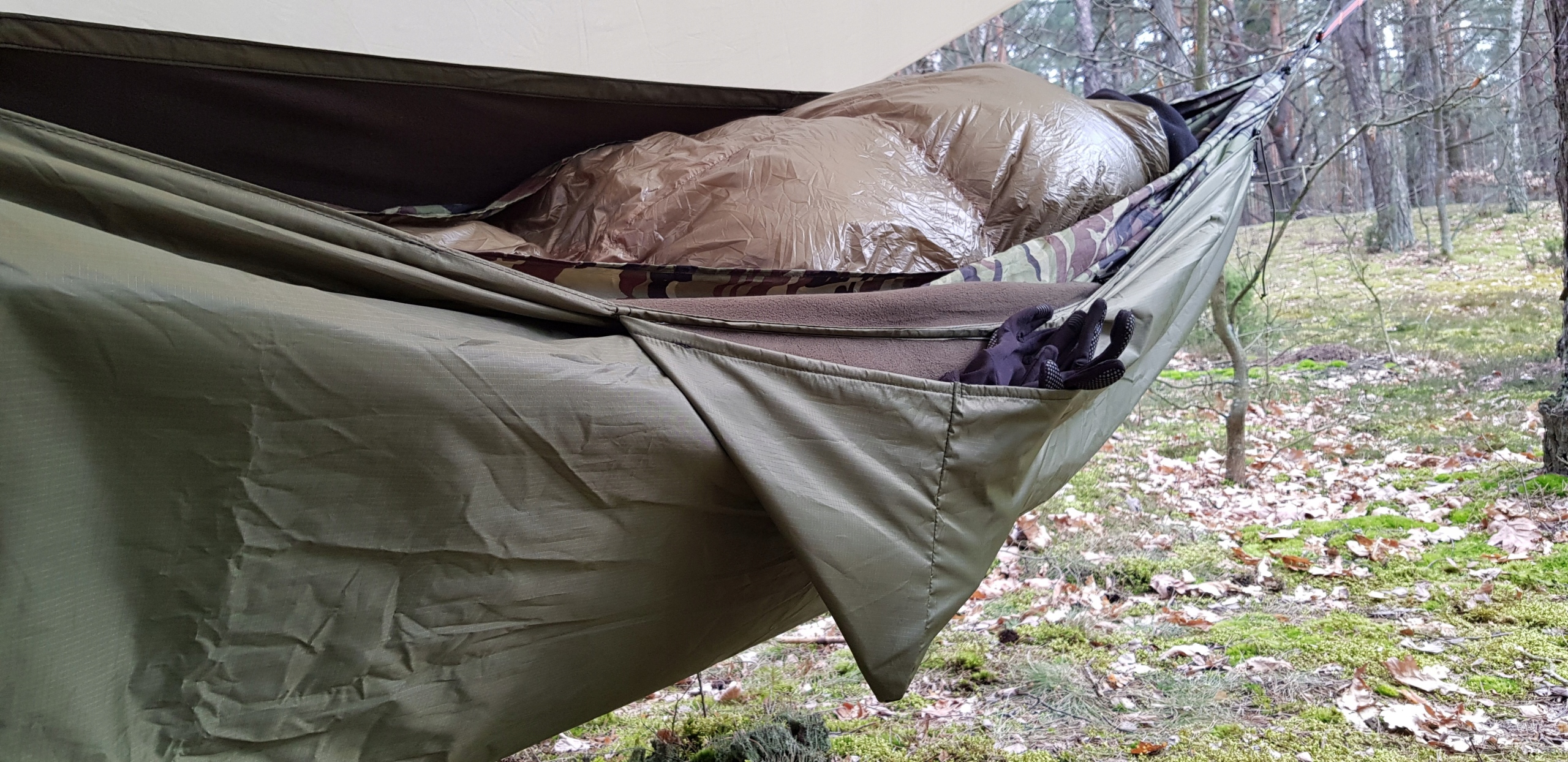 зручна, 3 сезонна підкладка для гамака. Захищає від холоду, вітру та дощу. Завдяки використанню натягувачів це дуже просто.