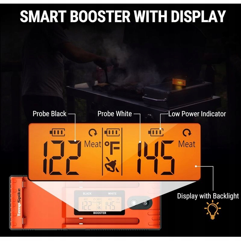 РК-дисплей із підсвічуванням дає змогу готувати в темних умовах освітлення, що полегшує перевірку їжі, ніж будь-коли. Цей кулінарний термометр Bluetooth поставляється з двома термометрами бездротові зонди для м'ясакожний з двома окремими датчиками, які допоможуть вам отриматиповний огляд температури в приміщенні / харчове середовище. На відміну від інших термометрів кухні та їхні непривабливі дроти, має цей бездротовий термометр повністю бездротовий дизайн без сплутувань і розтягувань кабелі, що робить його більш універсальним і простим у використанні, ідеально підходить для **плити, духовки, гриля, коптильні і багато іншого.
