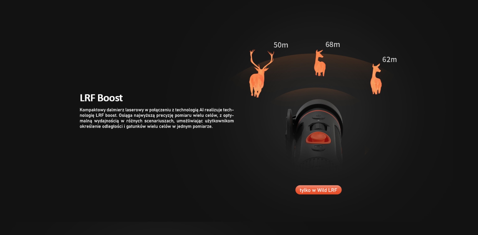 Позначення l означає, що монокуляр також оснащений лазерним дальником з діапазоном 1000 м, довжиною хвилі 905 нм та точністю до 1 метра. Крім того, завдяки технології LRF Boost за допомогою штучного інтелекту, пристрій може демонструвати відстань кількох цілей одночасно.