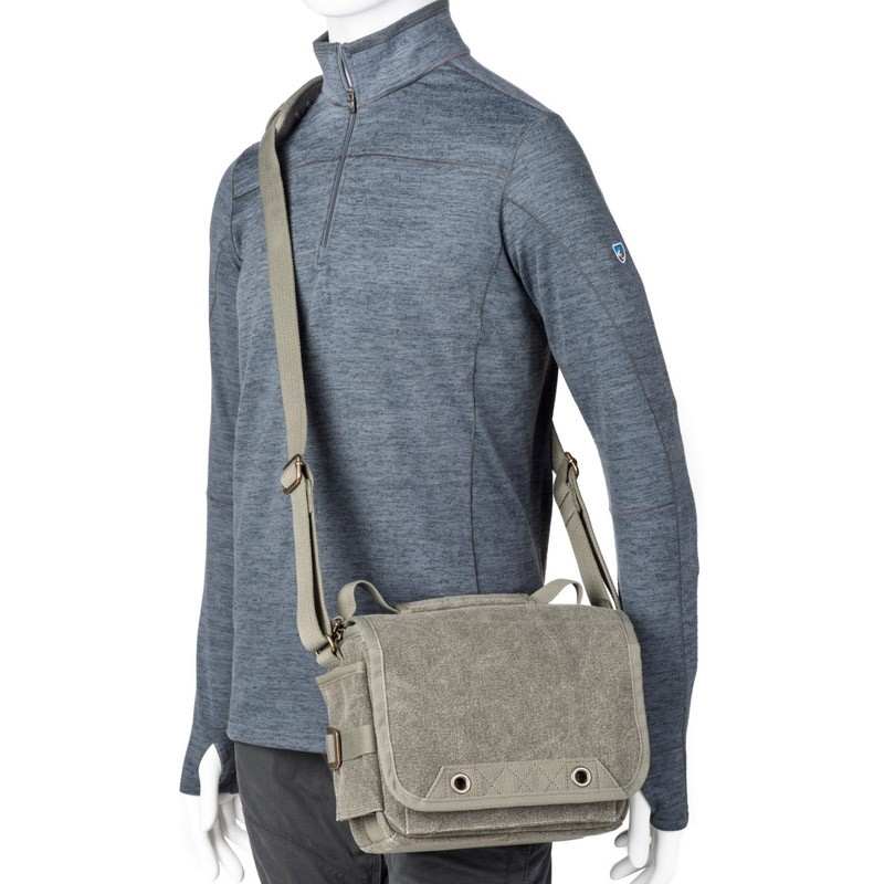 Сумка виготовлена з полотна, просоченого технологією DWR (Durable Water Repelency), що гарантує водонепроникність матеріалу. У просторому передньому відділенні легко поміститься павербанк або чохол для карти пам'яті, а в задній кишені на блискавці можна розмістити документи або гаманець. Коли відкривається, клапан, закритий за допомогою липучки, дає миттєвий доступ до вмісту сумки.