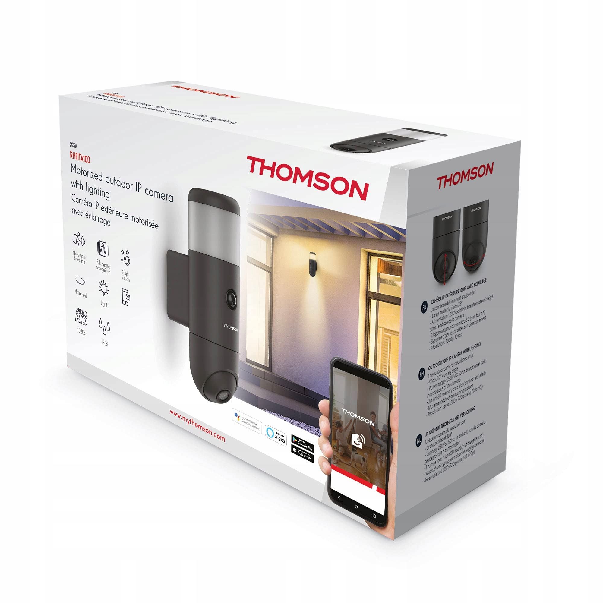 Камера Thomson Rheita100 сумісна з Alexa та Google Home, що дозволяє легко підключитися до смартфона за допомогою програми Thomson at Home Security. Крім того, 1500 люменів основної лампи та підсвічування 2 х 100 забезпечують ефективне освітлення, а функція тривоги з сиреною та світлодіодною лампою збільшує безпеку.