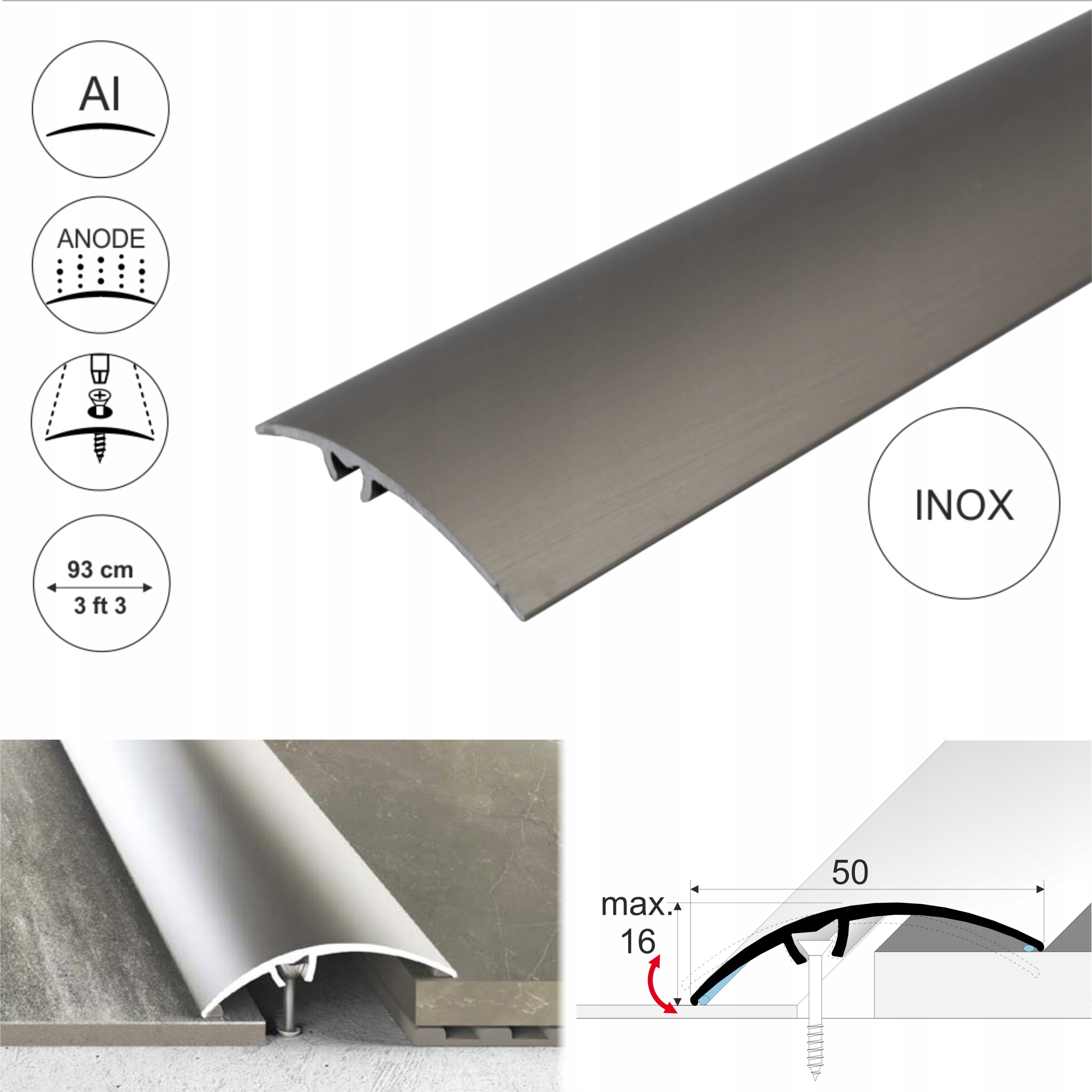 Накладка на поріг з алюмінію відмінної якості кольору нержавіючої сталі. Ідеально підходить для з’єднання дерев’яних, ламінованих, килимових, вінілових або плиткових підлог на одному або різних рівнях (макс. до 16 мм). Дві силіконові ущільнювачі створюють бар'єр від вологи та бруду навколо стрічки. Закриває щілини між підлогами.