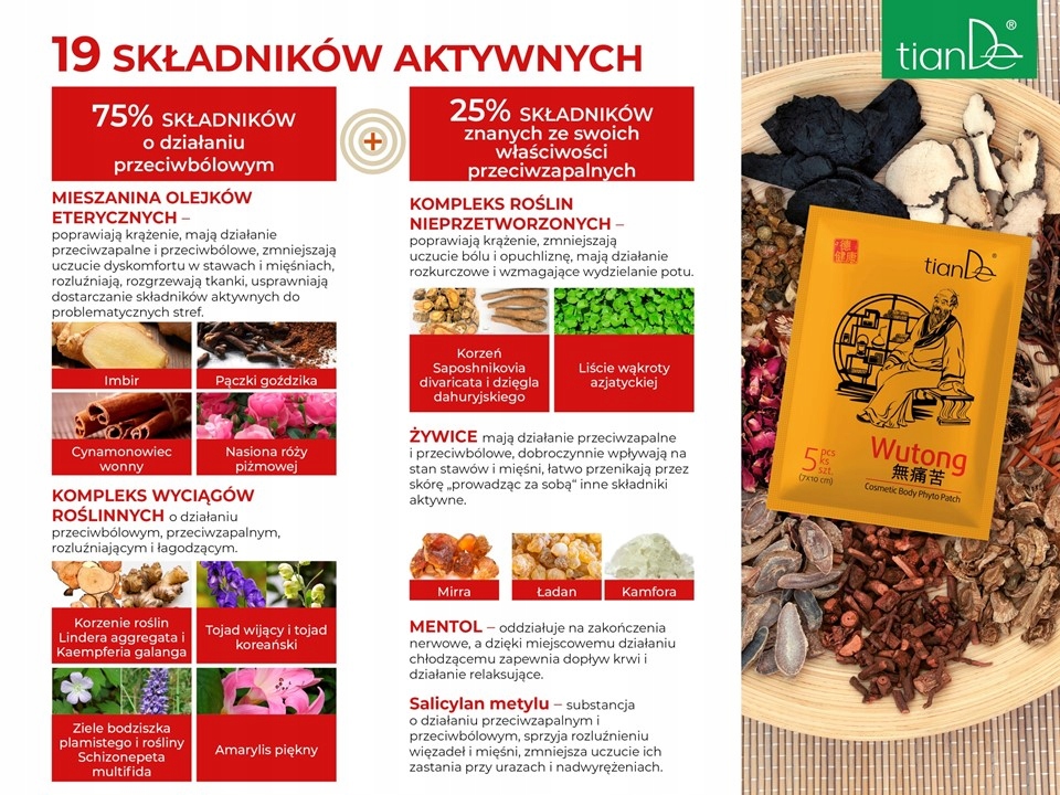 З чого складається косметичний трав'яний пластир для тіла TianDe? Давайте розглянемо окремі елементи: