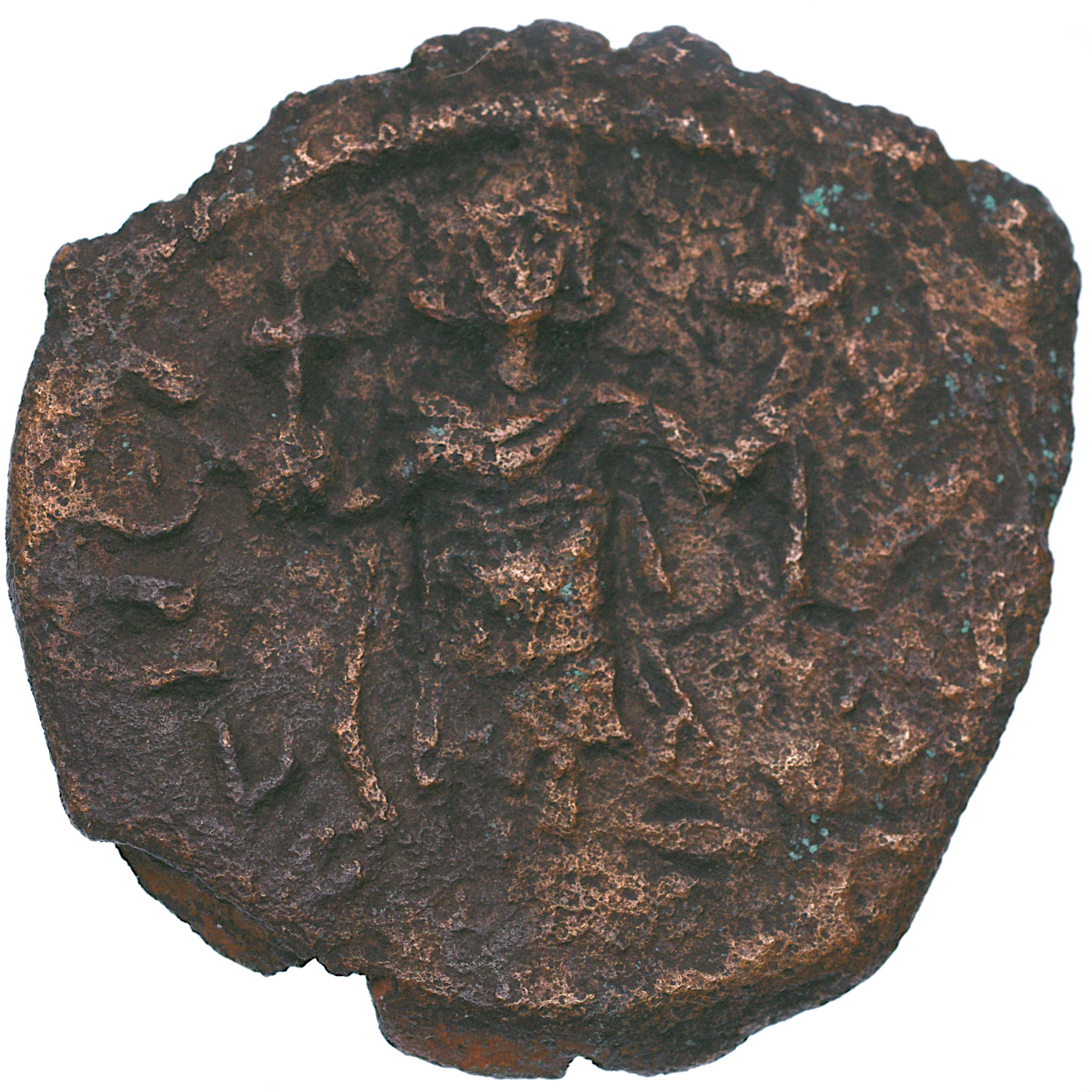 Аверс:DN ТИБР...; Тиберій стоїть попереду, тримає земну кулю та довгий хрест.