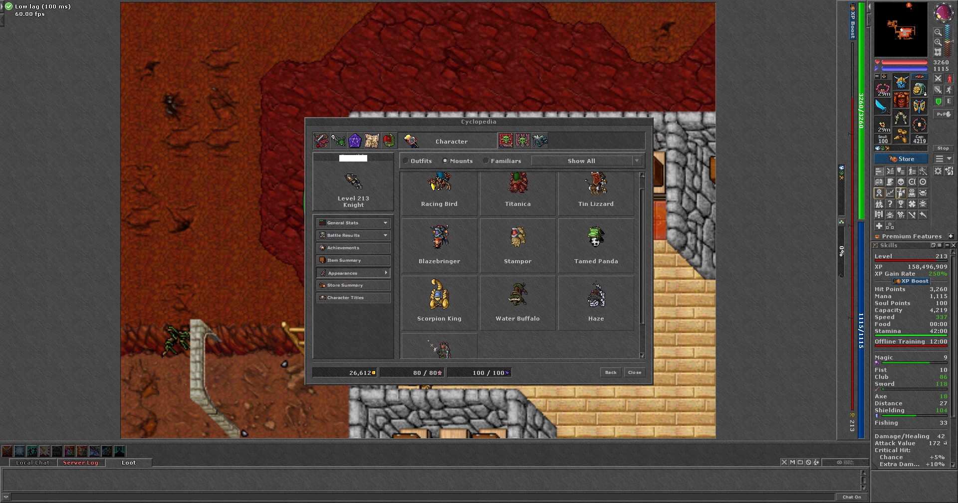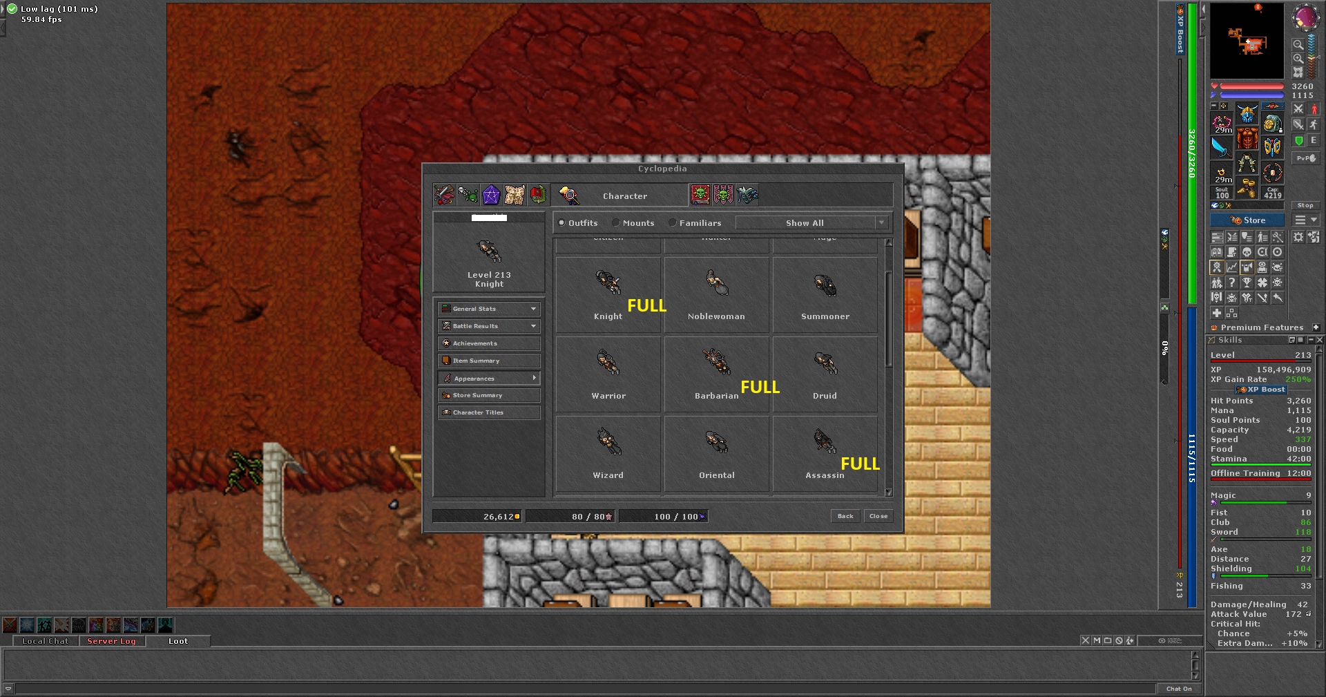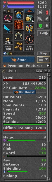 Tibia 213 EK + 118/104 + Quests + 10 кріплення + 7 нарядів + Monza + EQ + Free RK