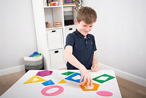 Наші правильні та неправильні форми TickiT® Jumbo ідеально підходять для вашої дитини, щоб дізнатися про геометричні фігури та їхні характеристики. Цікаві та тактильні, вони є цікавим наочним способом продемонструвати, що правильні форми мають рівні сторони та кути; тоді як неправильні форми можуть мати кути та сторони будь-якого значення. Внутрішня та зовнішня частини головоломки збігаються за кольором і атрибутами, напр. фіолетові шестикутники мають по 6 сторін; неправильна форма вписується всередину правильної форми, щоб підсилити розуміння того, що обидві форми все ще є шестикутниками, навіть якщо вони виглядають по-різному. Навчання розширення полягає в тому, що сума внутрішніх кутів правильної форми завжди дорівнюватиме сумі внутрішніх кутів відповідної неправильної форми. Також ідеально підходить для вивчення вашою дитиною математичної та геометричної термінології, як-от сторона, точка, крива, всередині, зовні, площа, 2D, тіло, 3D, кут і симетрія. Напівпрозорий кольоровий вигляд форм робить їх ідеальними для змішування кольорів і використання на світловій панелі. Їх розмір означає, що ними легко маніпулювати, завдяки чому вашій дитині буде легко визначати форми та кольори, використовувати їх для зіставлення або створення візерунків, ігор або шаблонів для малювання та розфарбовування. Виготовлені з акрилу товщиною 3 мм, форми є безпечними та міцними, з отвором 2,5 мм у верхній точці балансу, щоб ви могли створити мобіль фігури – чудово підходить для підвішування біля вікна, щоб відображати кольори та тіні форми. У набір входять: 12 акрилових форм синього, зеленого, жовтого, рожевого, оранжевого та фіолетового кольорів. Розмір: коло діаметром 13 см. Вік: не підходить для дітей до 3 років. Попередження: задушлива гра. Містить дрібні деталі.