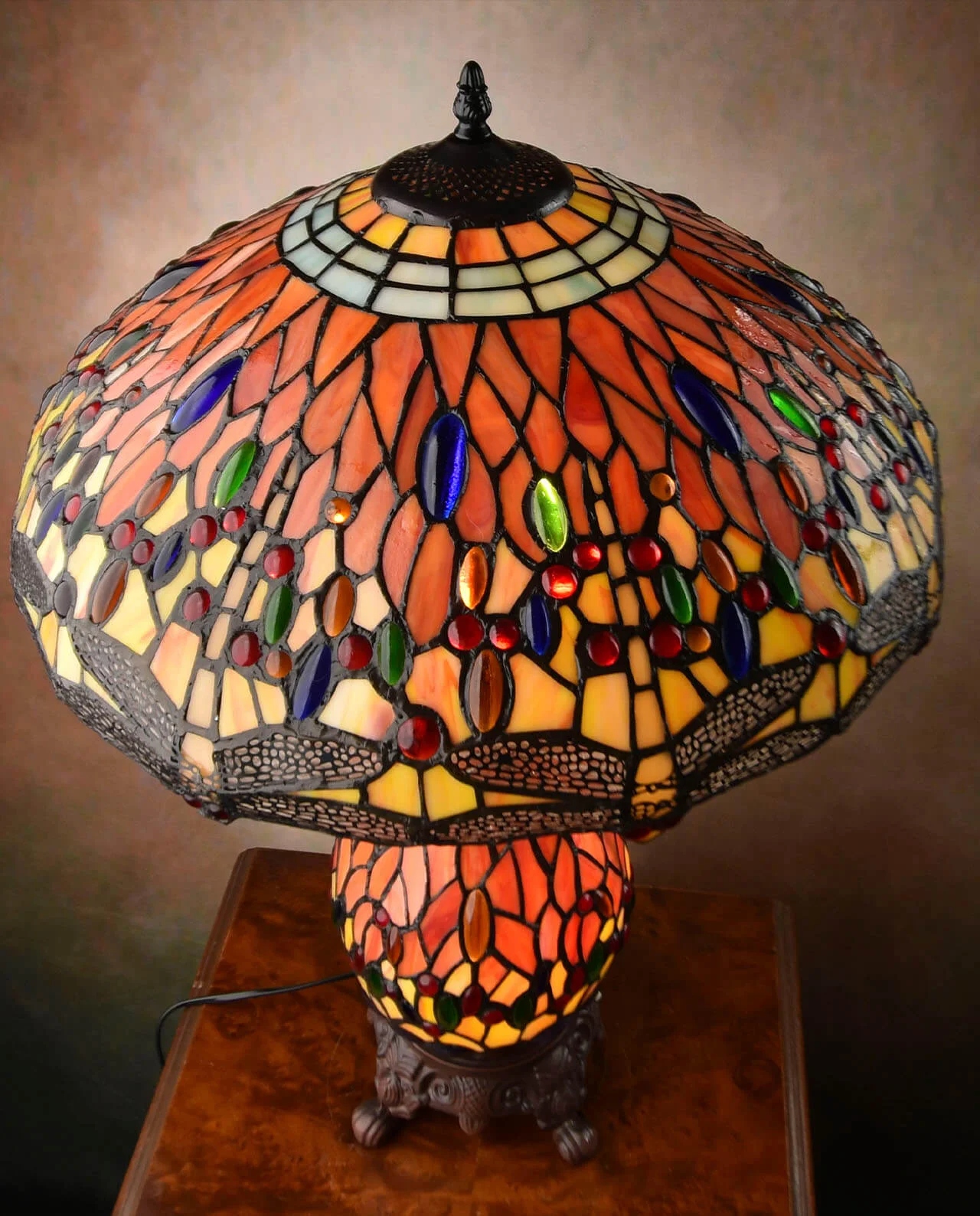 Прекрасна настільна лампа Тіффані. Унікальна, велика лампа з вітражами та вітражами, світиться основою. Виготовлений з ексклюзивних матеріалів - скляна та перлинна маса, дуже точно, з увагою до найменших деталей. Вся конструкція виготовлена з металу. Включає енергетичну лампочку з AA ++.