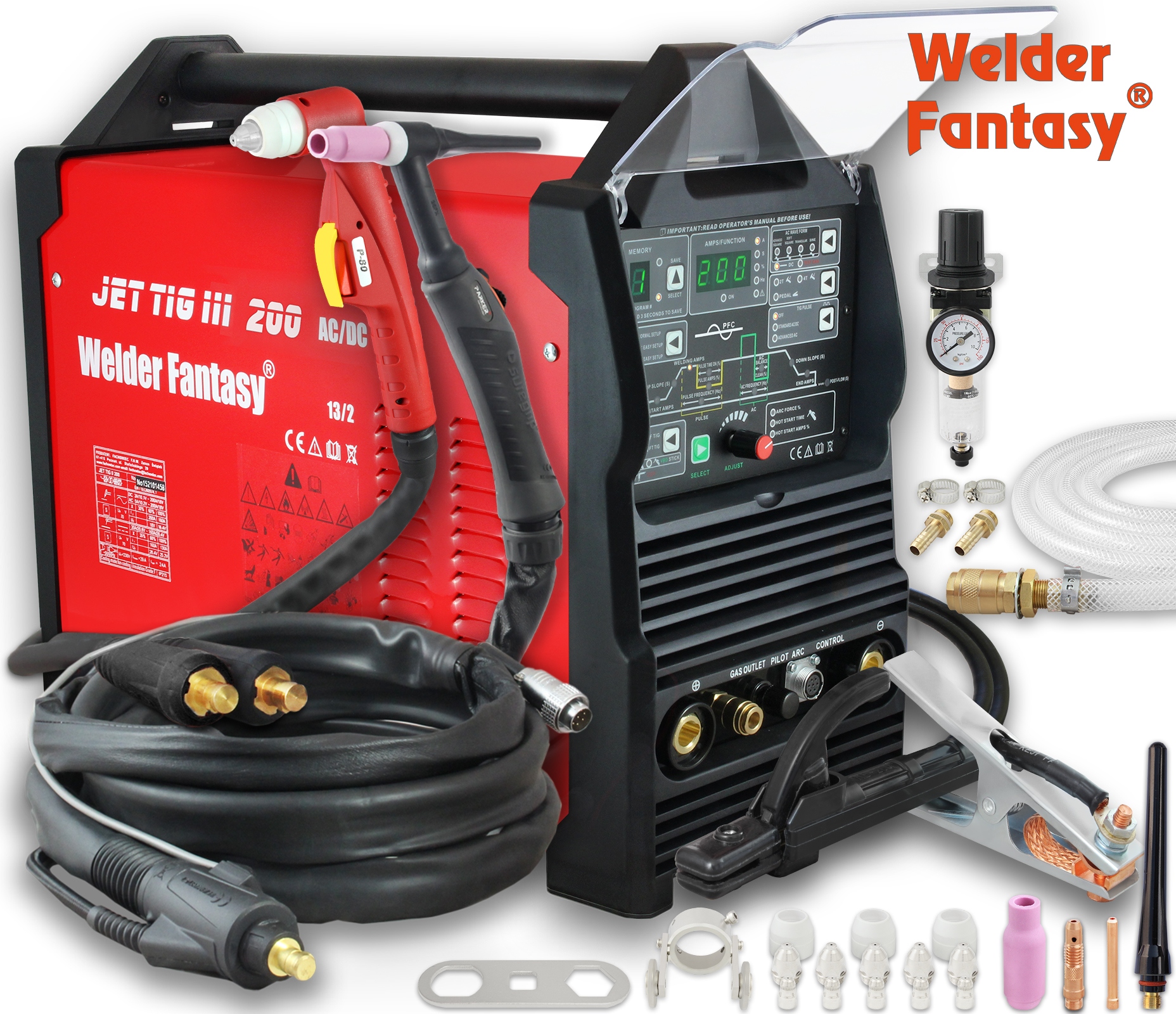 Промисловий зварювальний апарат Welder Fantasy JET III TIG AC/DC 200 IGBT - мікропроцесорний зварювальний джерело на основі технології IGBT, підходить для зварювання вуглецевої сталі, нержавіючої сталі, кислотостійкої сталі, міді, латуні. , магній, титан, всі алюмінієві сплави та плазмове різання.