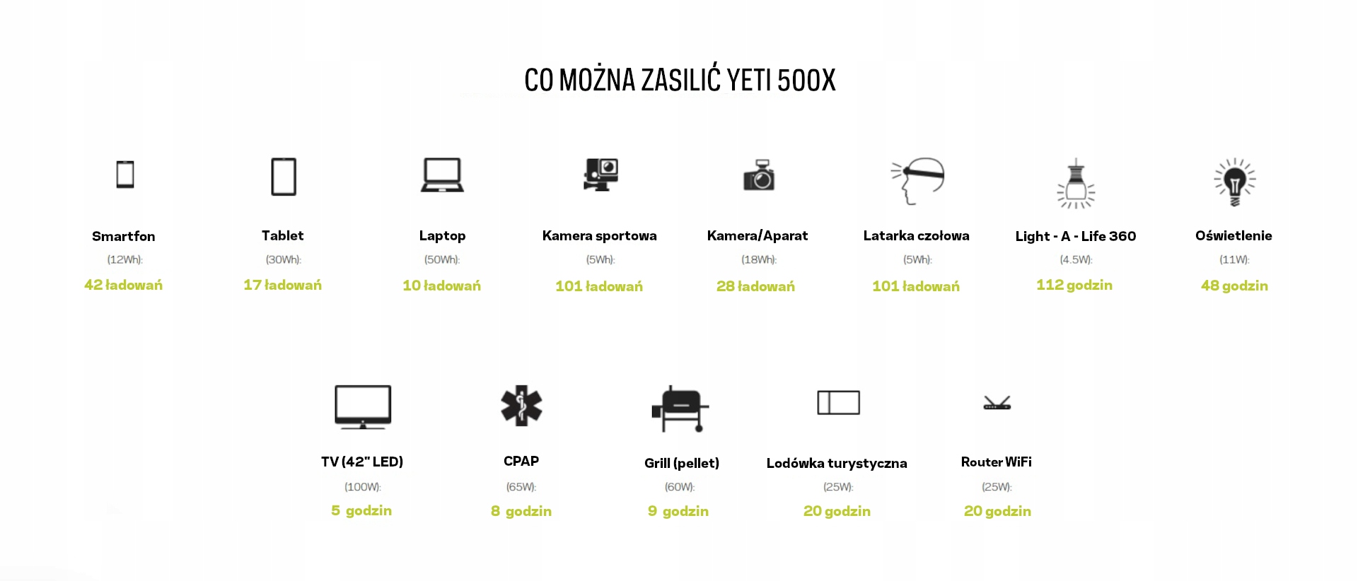Електростанція GOAL ZERO YETI 500 X дає вам багато можливостей. Оснащений мережевою розеткою 230 В, 12 В і 4 портами USB (2x USB-A, 1x USB-C і 1x USB-PD) дозволяє нам живити все, що вам потрібно. Ви можете живити кілька пристроїв одночасно! Заряджайте або живіть ноутбуки, планшети, смартфони, будь-яку меншу споживчу електроніку (годинники, камери, фари), а також кемпінговий холодильник або зарядні пристрої для електроінструментів. Все було створено в системі Plug&Play, тому все, що вам потрібно зробити, це вставити штекер у відповідний порт.