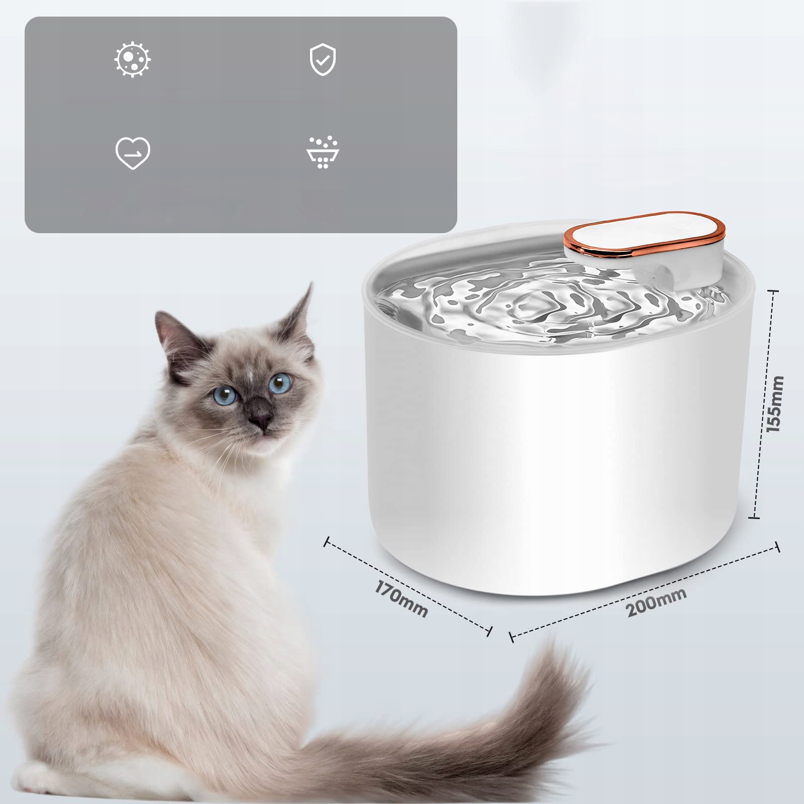 - Поїлка для котів оснащена системою фільтрації, яка забезпечує свіжу фільтровану воду в контурі. Він може видалити бруд і запах з води, зберігаючи воду чистою та прохолодною. Рекомендовано чистити лійку кожні 7 днів.